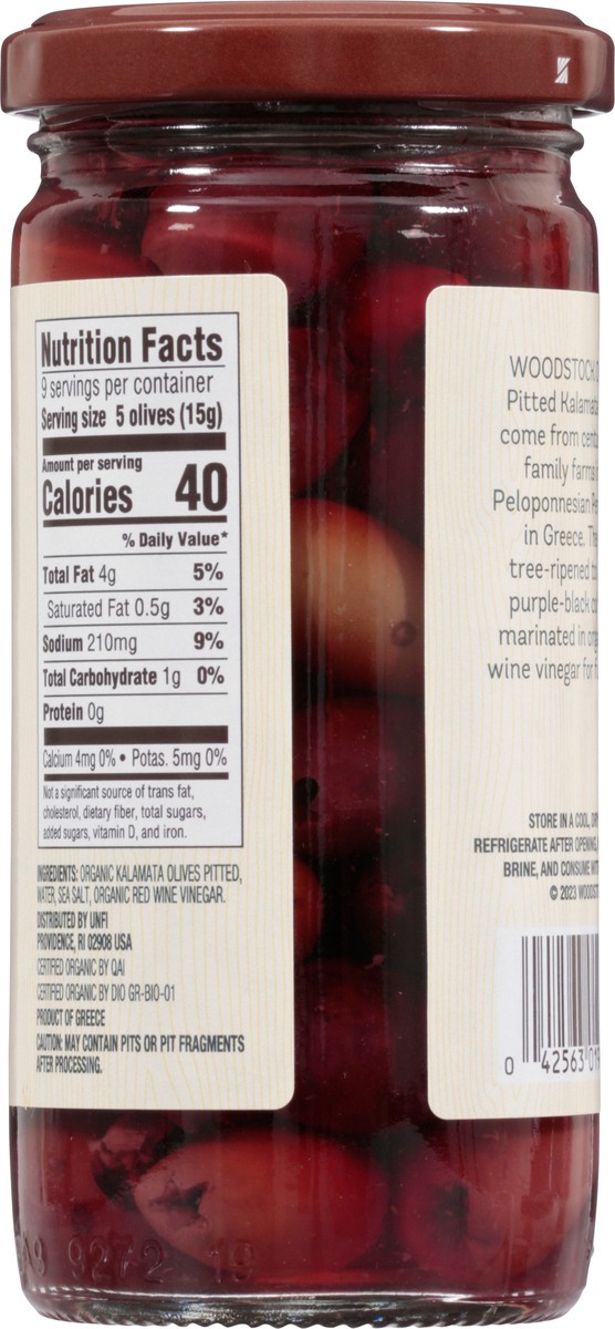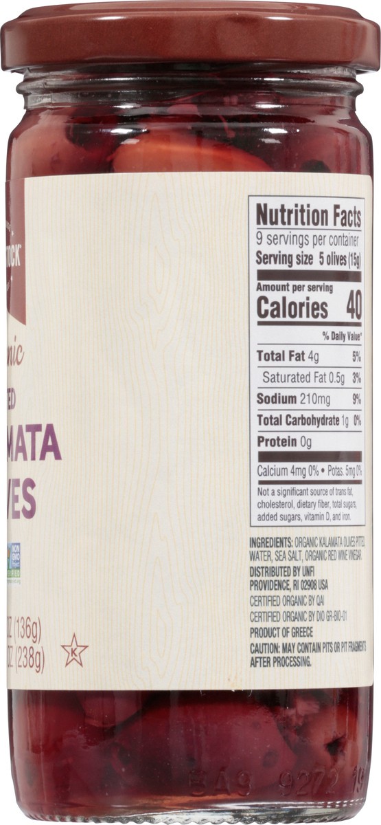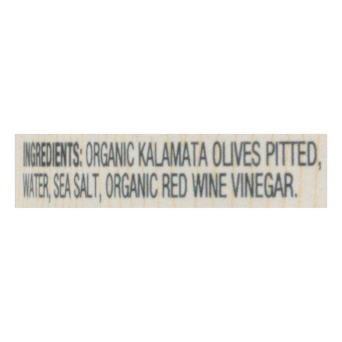 Organic Kalamata Olives Pitted, Water, Sea Salt, Organic Red Wine Vinegar.