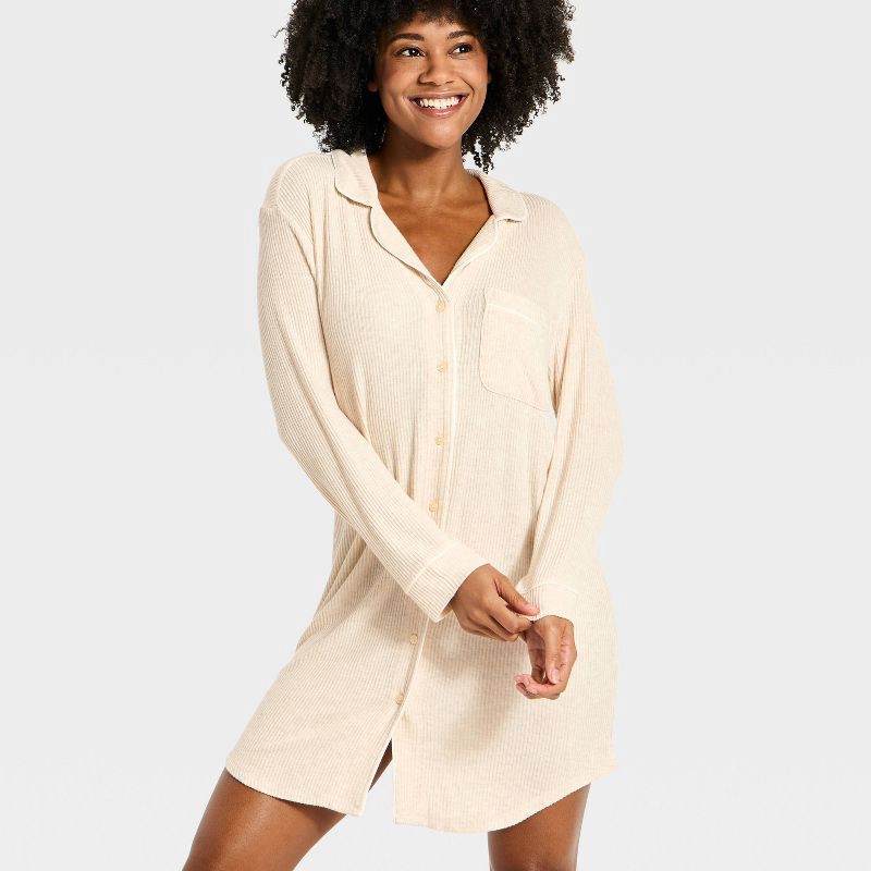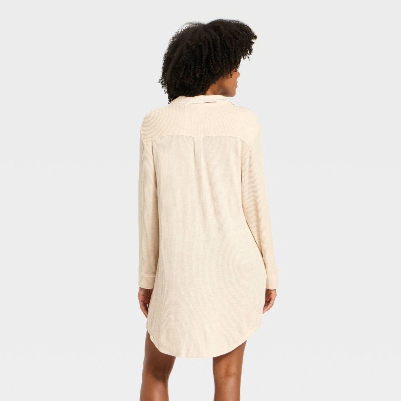 Women's Cozy Ribbed Notch Collar Pajama Gown - Auden™ Oat XS