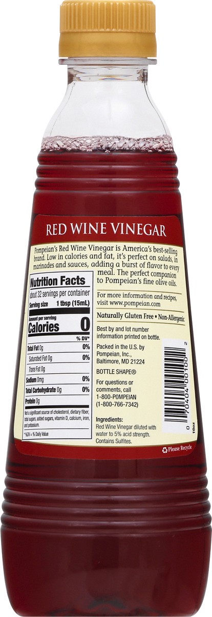 Naturally gluten free. Quality since 1906. Premium quality. Pompeian's Red Wine Vinegar is America's best-selling brand. Low in calories and fat, it's perfect on salads, in marinades and sauces, addin…