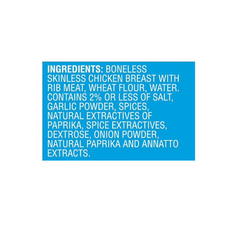 Boneless Skinless Chicken Breast with Rib Meat, Wheat Flour, Water, Contains 2% or less of Salt, Corn Starch, Sugar, Yellow Corn Flour, Garlic Powder, Spices, Onion Powder, Extractives of Paprika and …