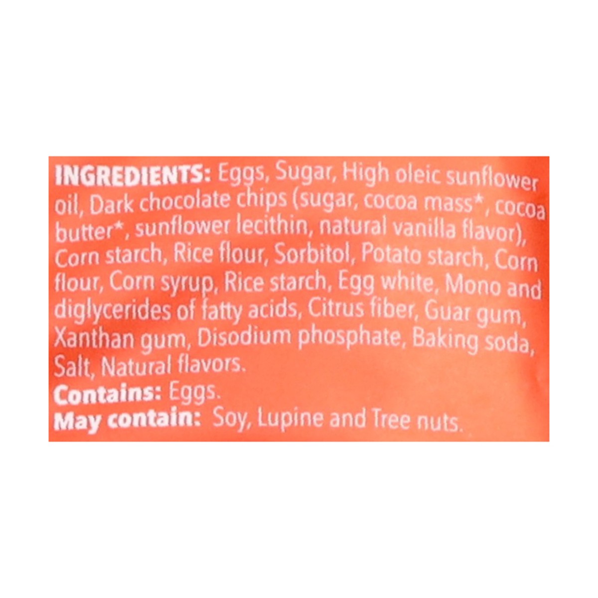 Eggs, Sugar, High Oleic Sunflower Oil, Dark Chocolate Chips (Sugar, Cocoa Mass (Rainforest Alliance Certified, Find Out More at Ra,Org), Cocoa Butter (Rainforest Alliance Certified, Find Out More at R…