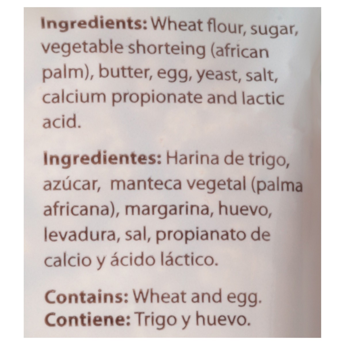 Wheat Flour, Sugar, Vegetable Shorteing (African Palm), Butter, Egg, Yeast, Salt, Calcium Propionate and Lactic Acid.
