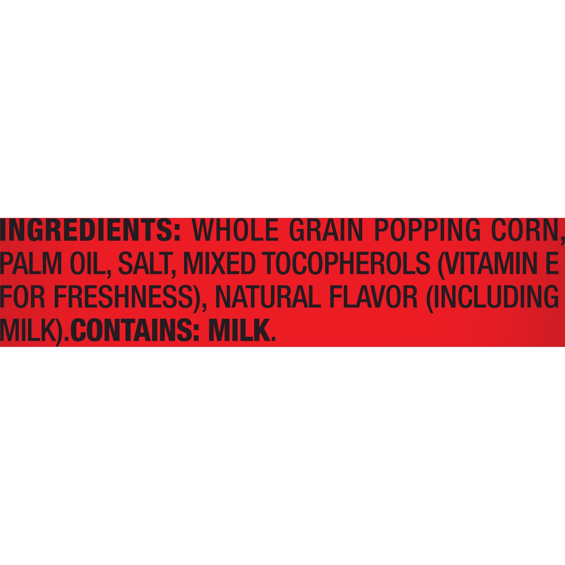 Whole Grain Popping Corn, Palm Oil, Salt, Butter, Mixed Tocopherols (Vitamin E for Freshness), Natural Flavor.