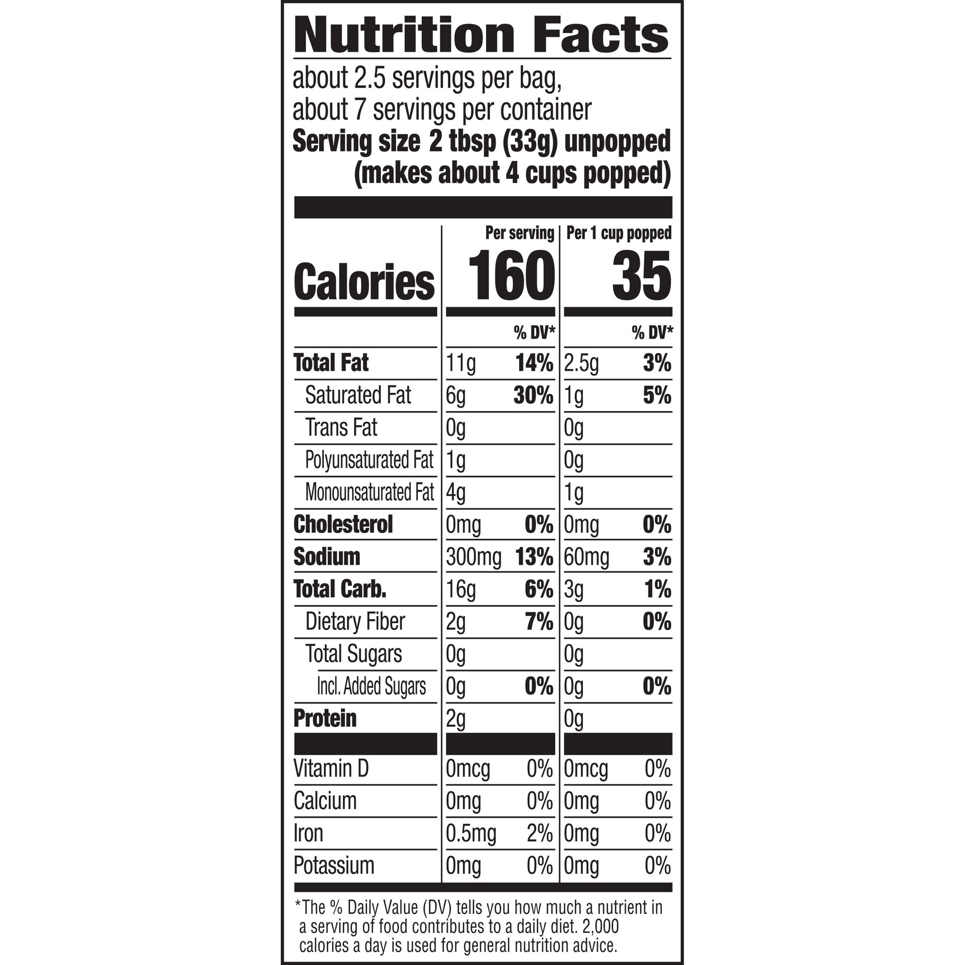 Gourmet white corn blended with real butter. No artificial preservatives; flavors; dyes. Per 2 tbsp Unpopped: 170 calories; 5 g sat fat (25% DV); 280 mg sodium (12% DV); 0 g total sugars. Microwave. I…