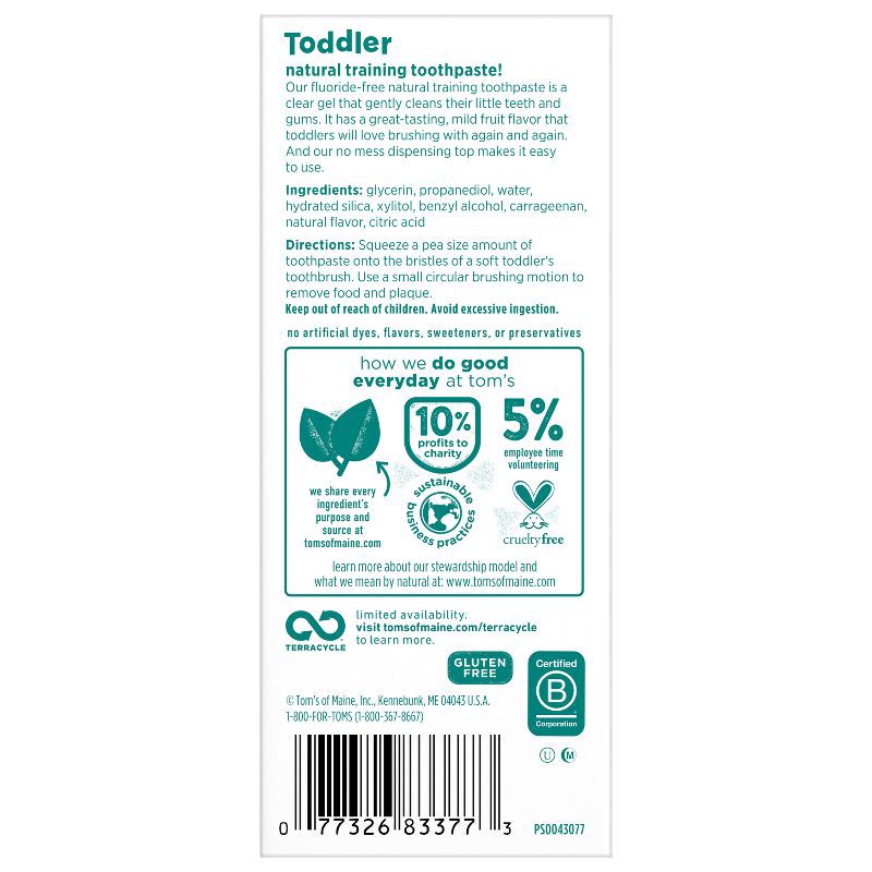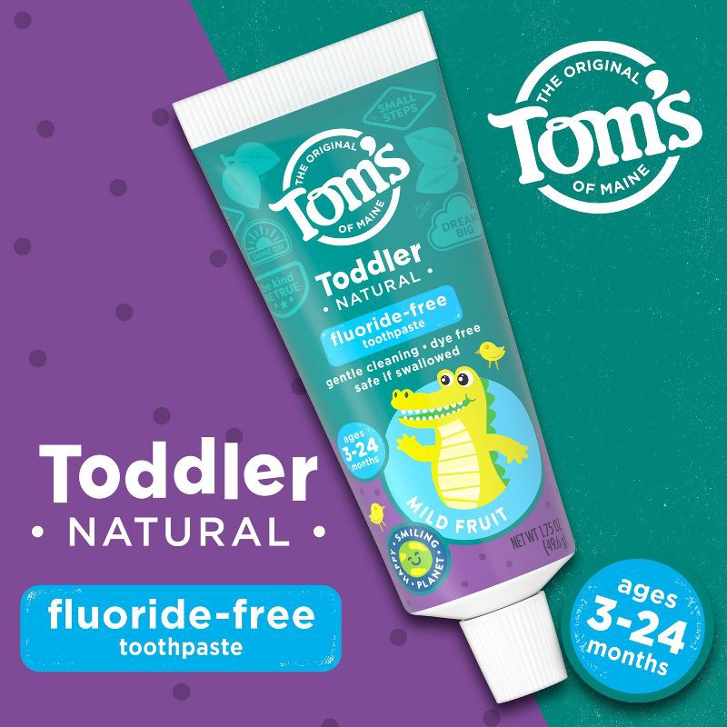 - Includes one (1) 1.75 oz tube of Tom's of Maine Fluoride Free Toddler Training Toothpaste
