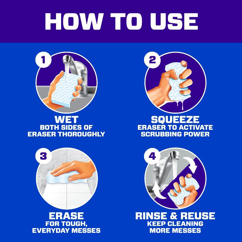 - TACKLE MESSES IN 3 EASY STEPS - Just wet both side of the eraser, squeeze to activate scrubbing power, and erase every day, tough messes with ease.