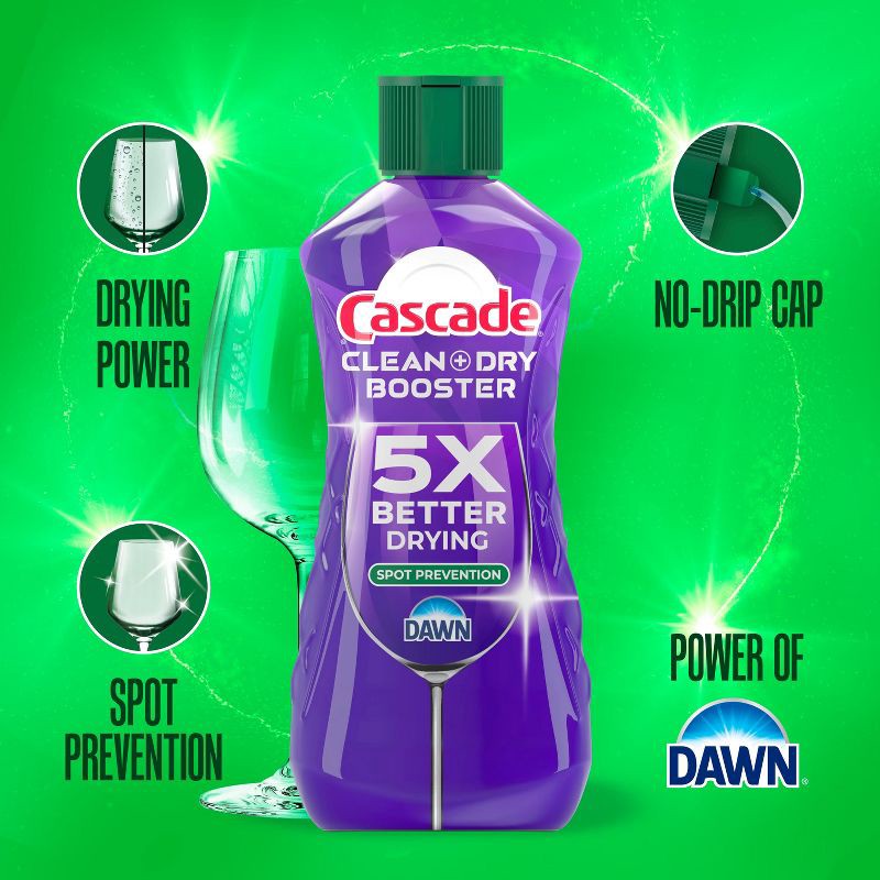 Cascade Clean & Dry Booster has 5X the drying power of detergent alone, giving you drier dishes and preventing spots. Our rinse aid's sheeting action helps prevent dish water from clinging to your dis…