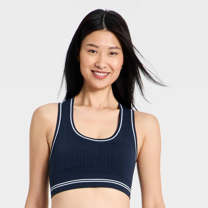 - Must-have features: seamless, removable padding, scoop neckline, ribbed edges with varsity stripes, racerback