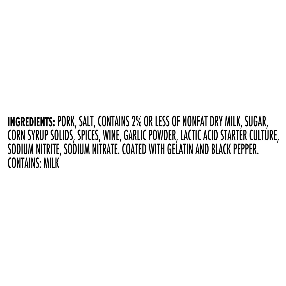 Pork, Salt, Contains 2% or Less of Nonfat Dry Milk, Sugar, Corn Syrup Solids, Spices, Wine, Garlic Powder, Lactic Acid Starter Culture, Sodium Nitrite, Sodium Nitrate, Coated with Gelatin and Black Pe…