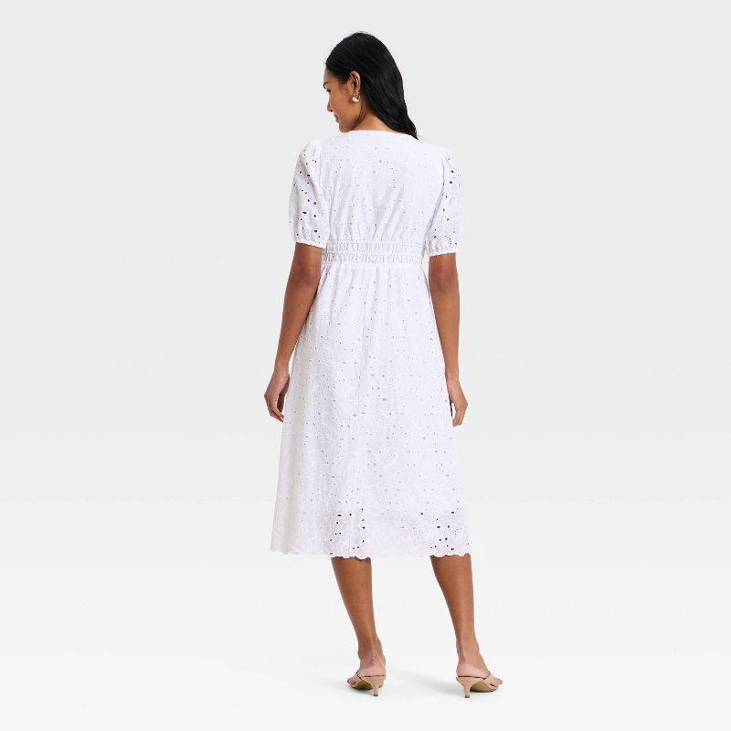 Women's Puff Elbow Sleeve Eyelet Midi Empire Waist Dress - A New Day™ White S
