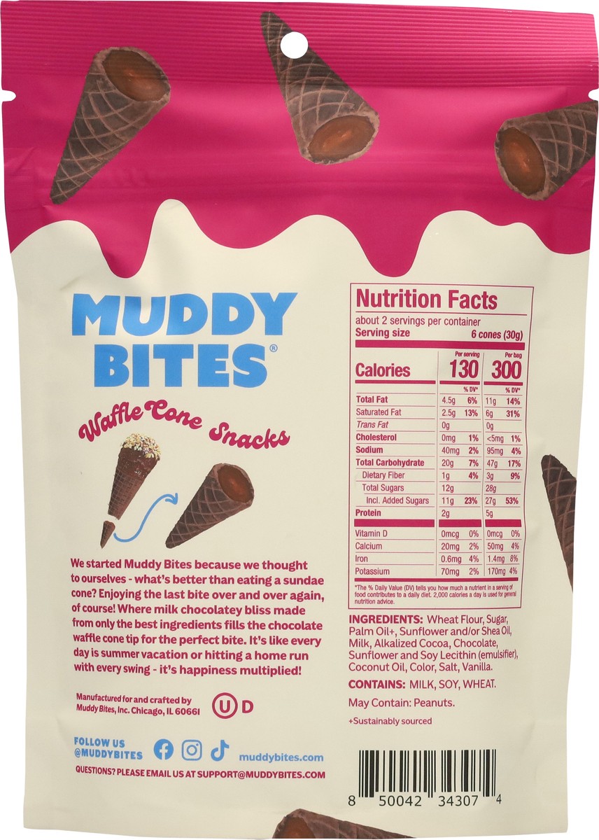 Indulge in a double dose of chocolatey goodness with Muddy Bites® Double Fudge Waffle Cone Snacks. Each mini cocoa waffle cone is filled with rich, creamy milk chocolate for an irresistible combinatio…