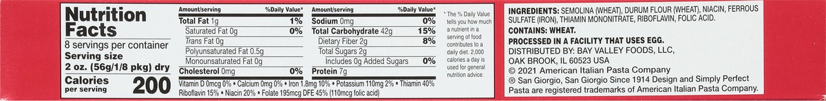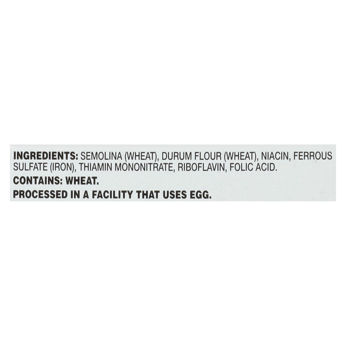 Semolina (Wheat), Durum Flour (Wheat), Niacin, Ferrous Sulfate (Iron), Thiamin Mononitrate, Riboflavin, Folic Acid.