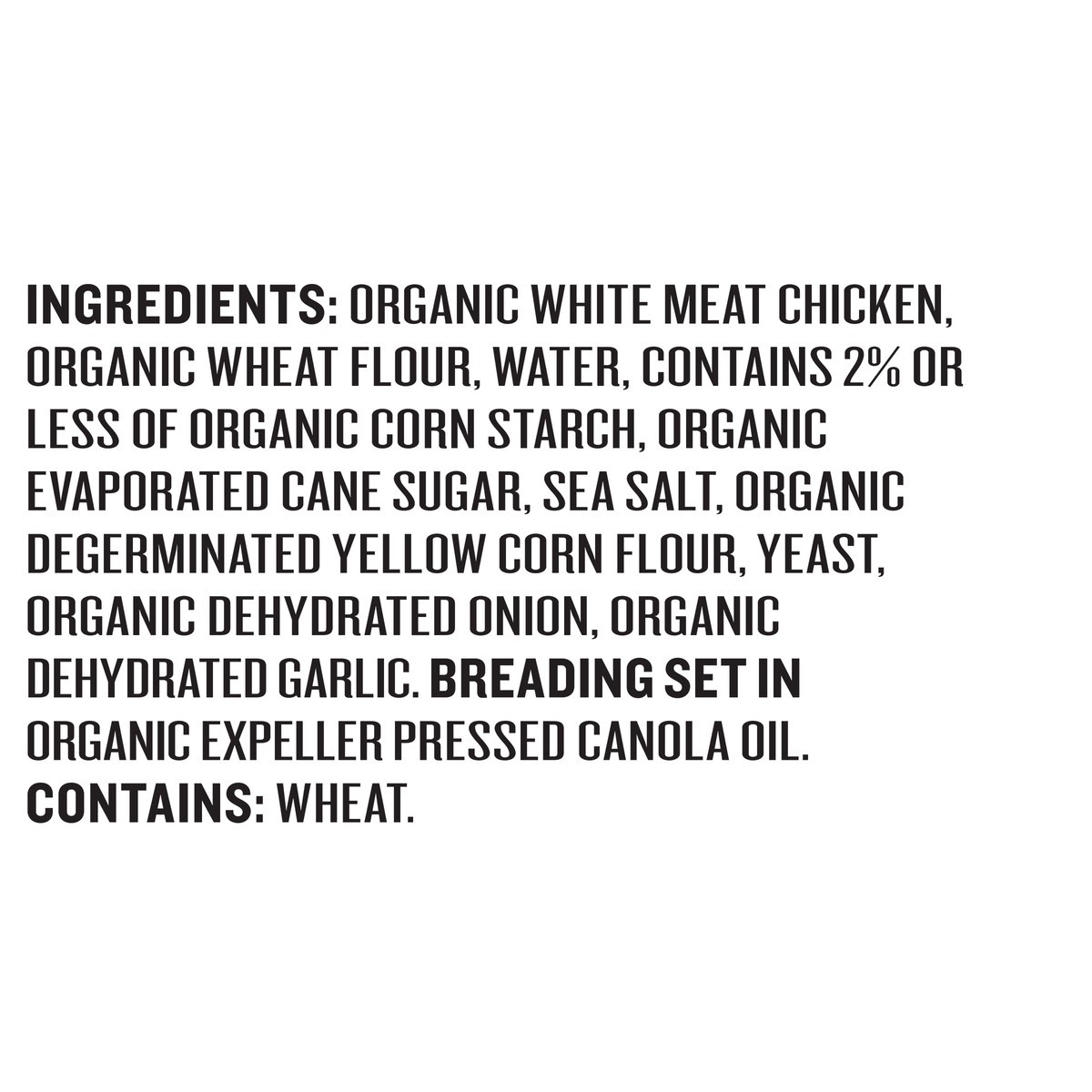 Organic White Meat Chicken**, Organic Wheat Flour, Water. Contains Less Than 2% Of The Following: Organic Corn Starch, Organic Evaporated Cane Sugar, Sea Salt, Organic Degerminated Yellow Corn Flour, …