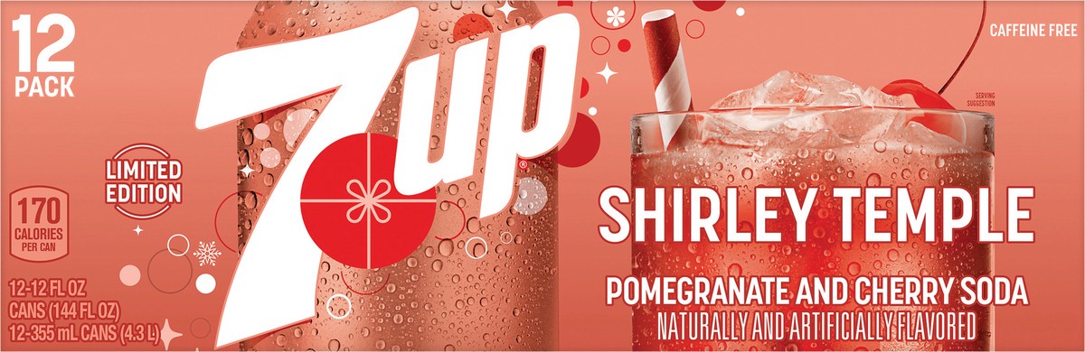 The most classic mocktail of all time is now available as a 7UP flavor. 7UP Shirley Temple soda offers a unique, sweet taste of pomegranate and cherry flavors combined with the crisp, clean taste of l…