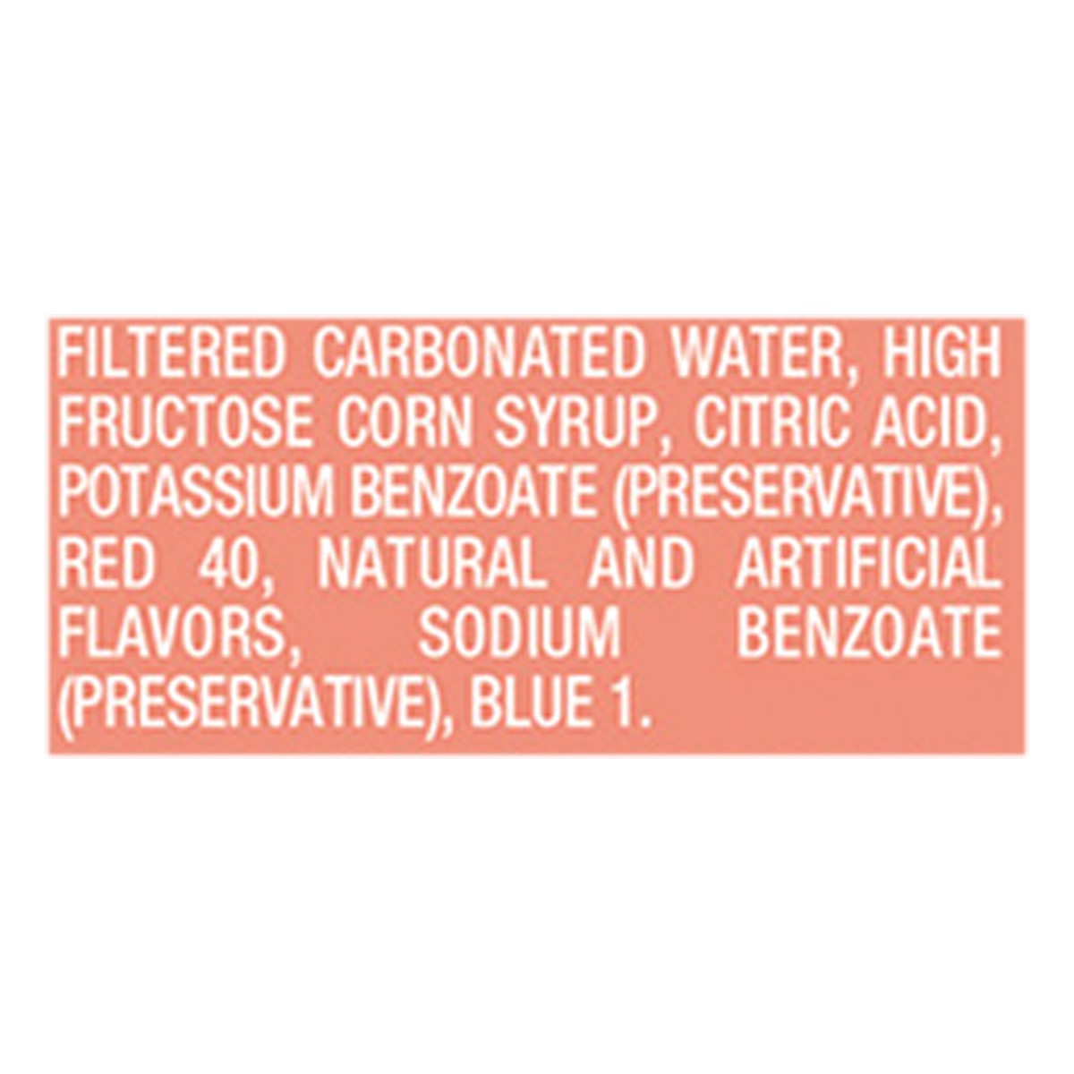 Filtered Carbonated Water, High Fructose Corn Syrup, Citric Acid, Potassium Benzoate (Preservative), Red 40, Natural and Artificial Flavors, Sodium Benzoate (Preservative), Blue 1.