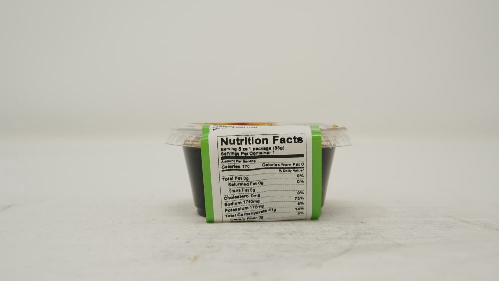 Ingredients: Yummi Sushi Sauce (Sugar, Soy Sauce [Water, Wheat, Soybeans, Salt], Water, Corn Syrup, Mirin [Sweet Cooking Rice Wine], Modified Corn Starch, Caramel Color, Salt, Xanthan Gum)