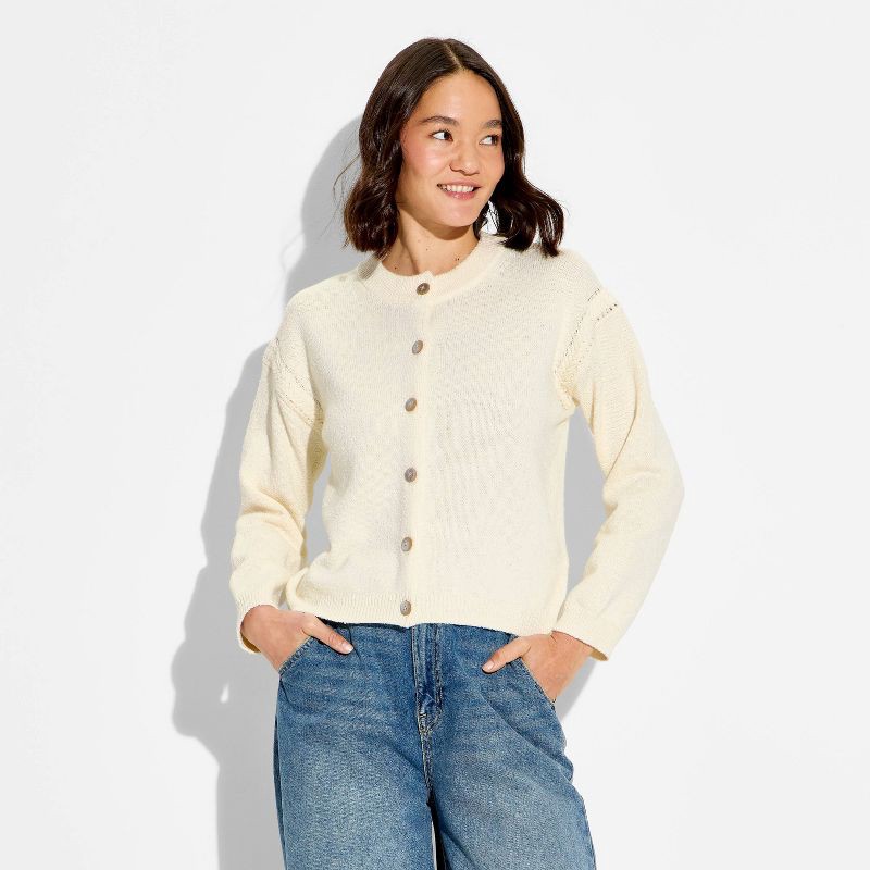 Women's Crewneck Cable Trim Cardigan - Wild Fable™ Off-White S