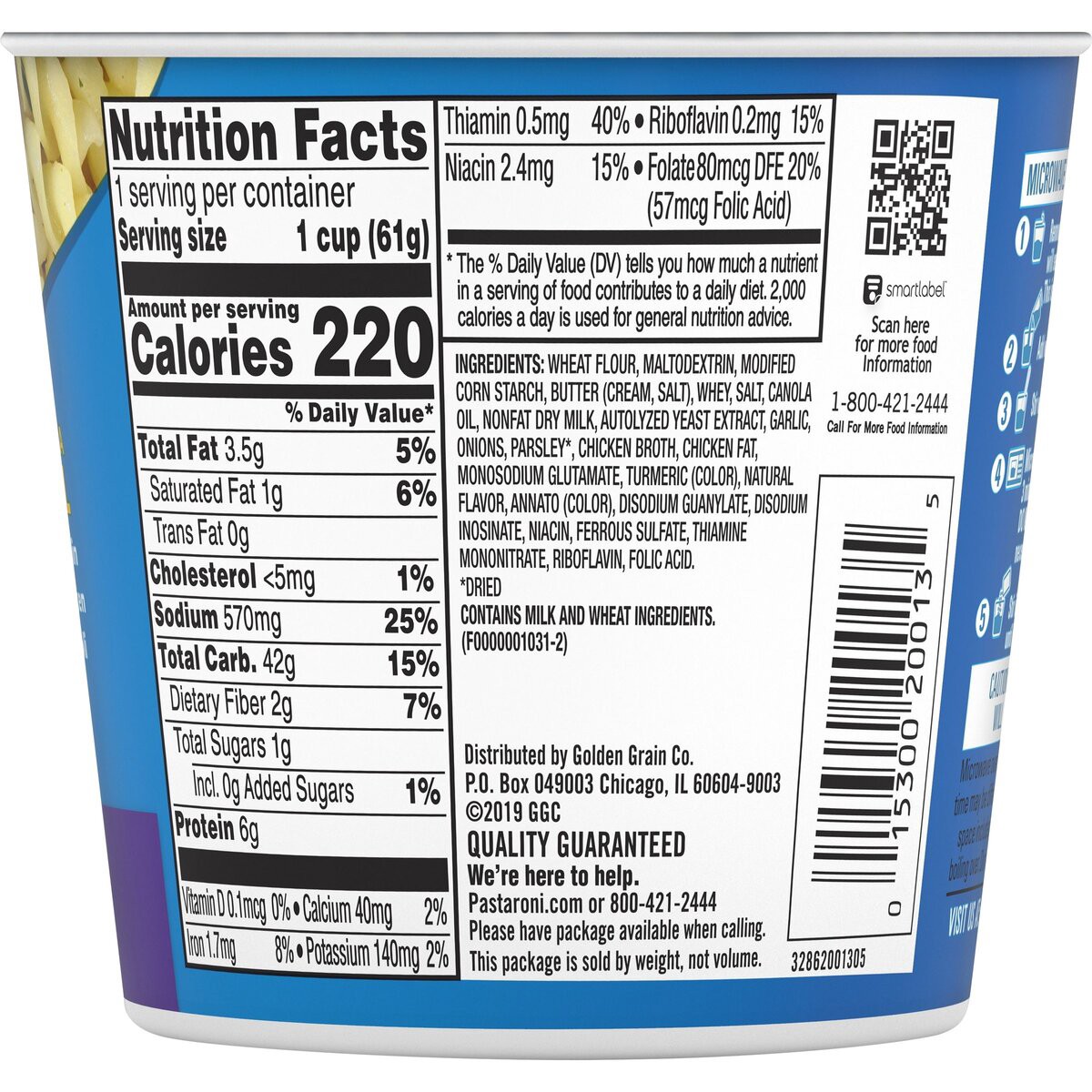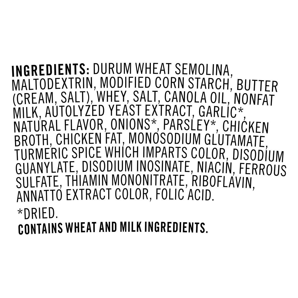 DURUM WHEAT SEMOLINA, MALTODEXTRIN, MODIFIED CORN STARCH, BUTTER (CREAM, SALT), WHEY, SALT, CANOLA OIL, NONFAT MILK, AUTOLYZED YEAST EXTRACT, GARLIC*, NATURAL FLAVOR, ONIONS*, PARSLEY*, CHICKEN BROTH,…
