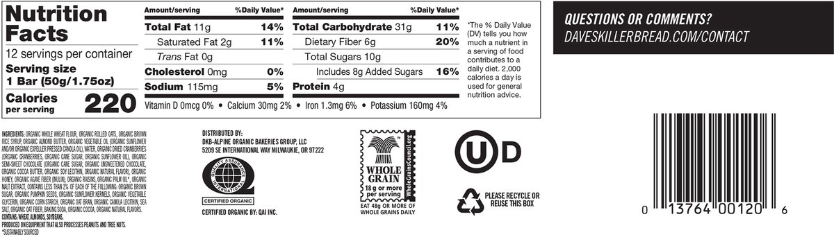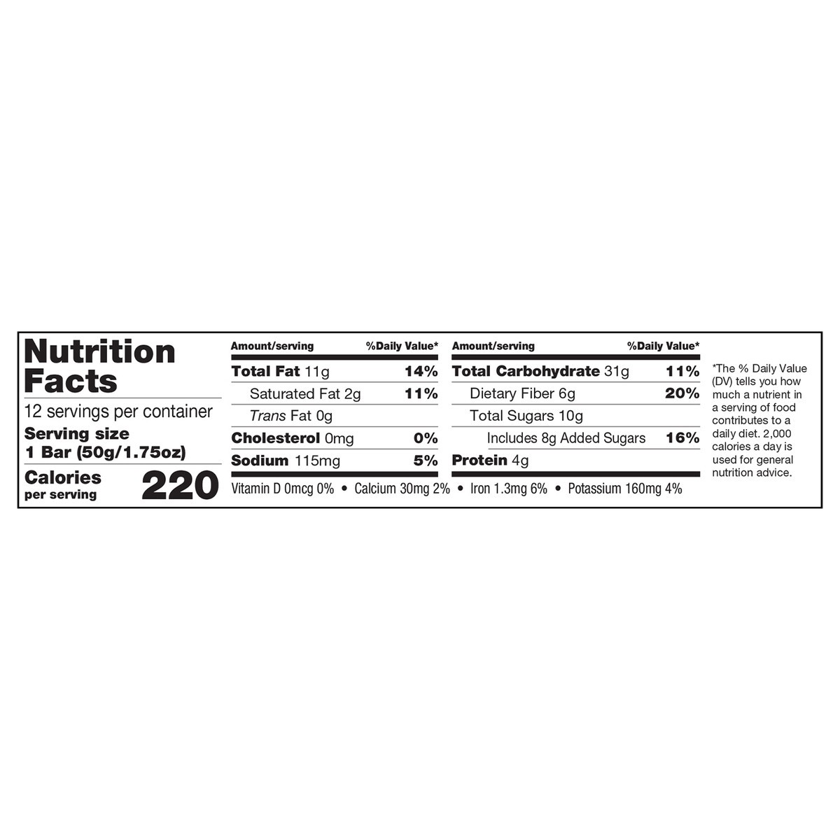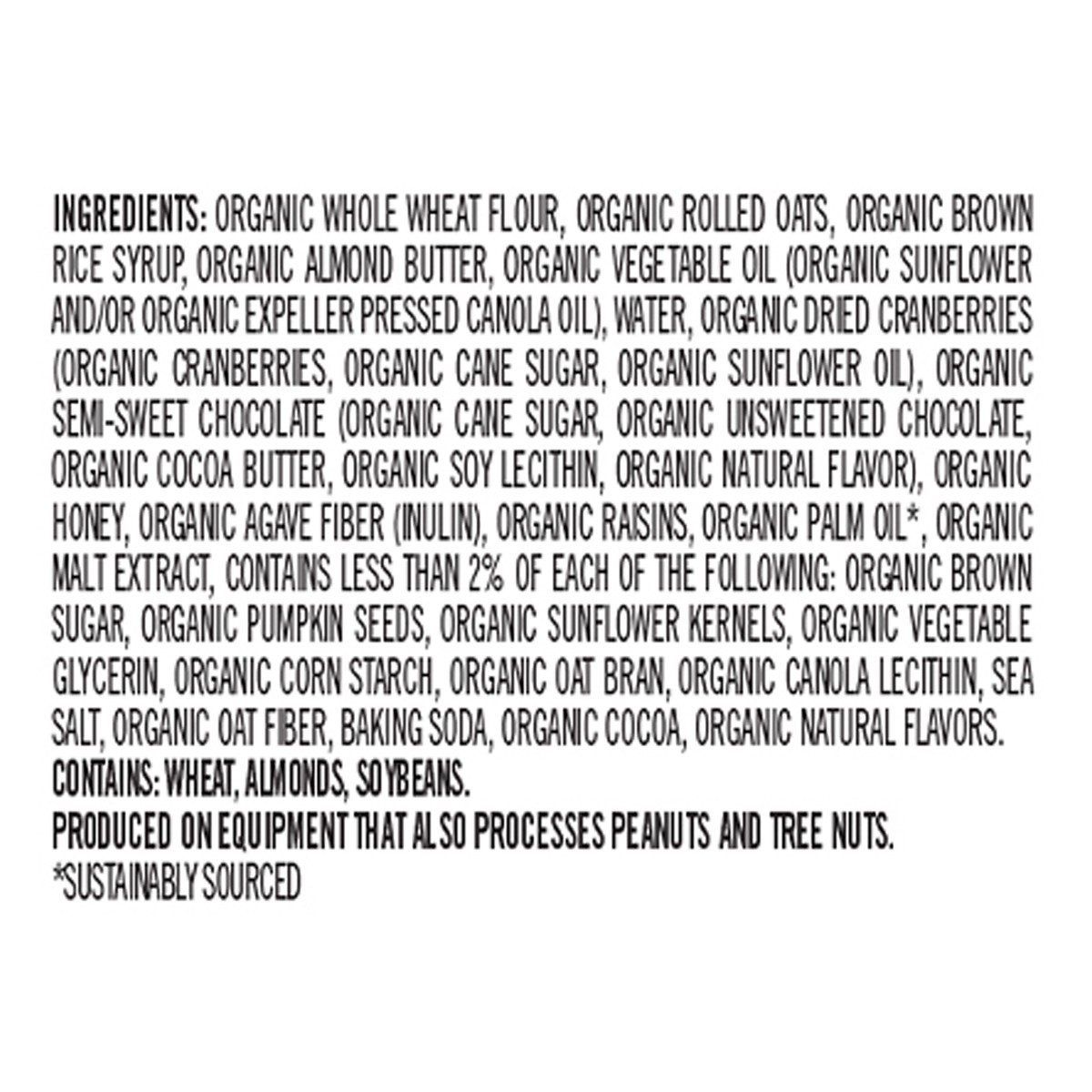 Organic Whole Wheat Flour, Organic Rolled Oats, Organic Brown Rice Syrup, Organic Almond Butter, Organic Vegetable Oil (Organic Sunflower and/or Organic Expeller Pressed Canola Oil), Water, Organic Dr…