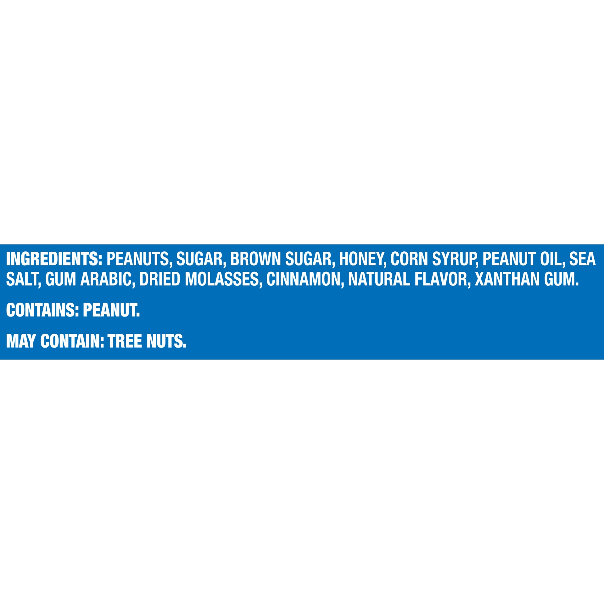 Peanuts, Sugar, Brown Sugar, Honey, Corn Syrup, Peanut Oil, Sea Salt, Gum Arabic, Dried Molasses, Cinnamon, Natural Flavor, Xanthan Gum.