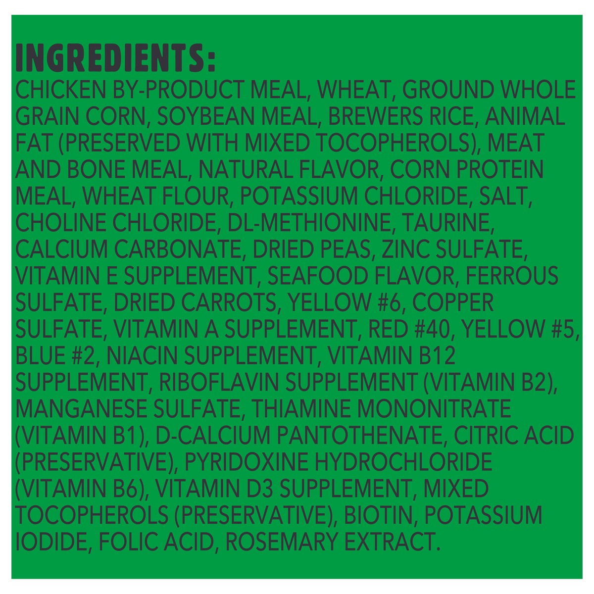 Chicken By-Product Meal, Ground Wheat, Ground Whole Grain Corn, Soybean Meal, Brewers Rice, Animal Fat (Preserved with Mixed Tocopherols), Meat and Bone Meal, Natural Flavor, Corn Protein Meal, Wheat …