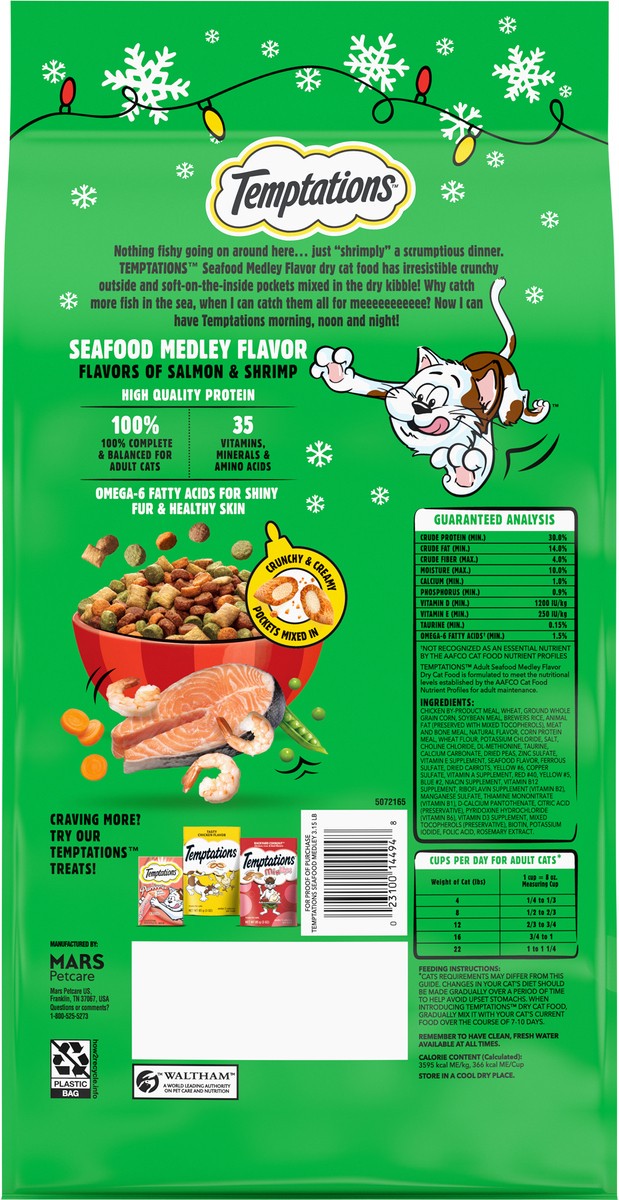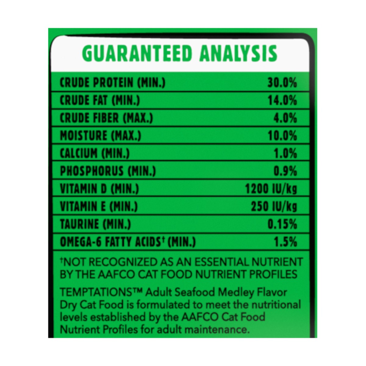 Calorie Content (Calculated): 3595 kcal ME/kg, 366 kcal ME/cup. Temptations adult seafood medley flavor dry cat food is formulated to meet the nutritional levels established by the AAFCO cat food nutr…