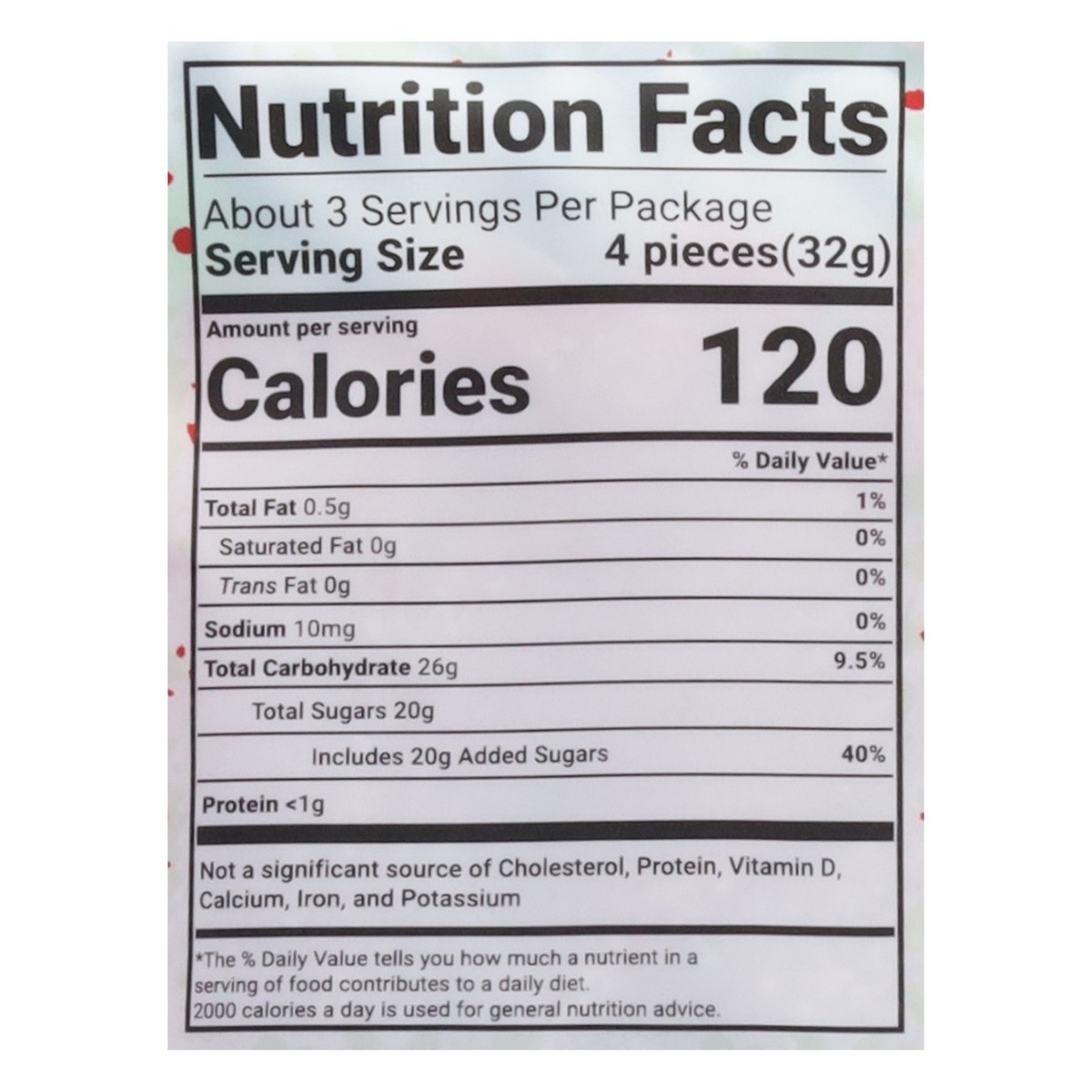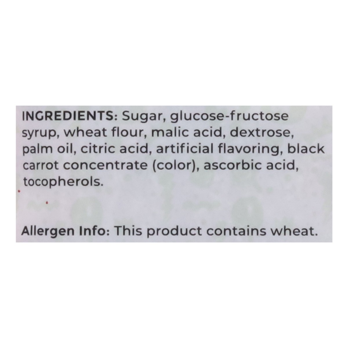 Sugar, Glucose-Fructose Syrup, Wheat Flour, Malic Acid, Dextrose, Palm Oil, Citric Acid, Artificial Flavoring, Black Carrot Concentrate (Color), Ascorbic Acid, Tocopherols.