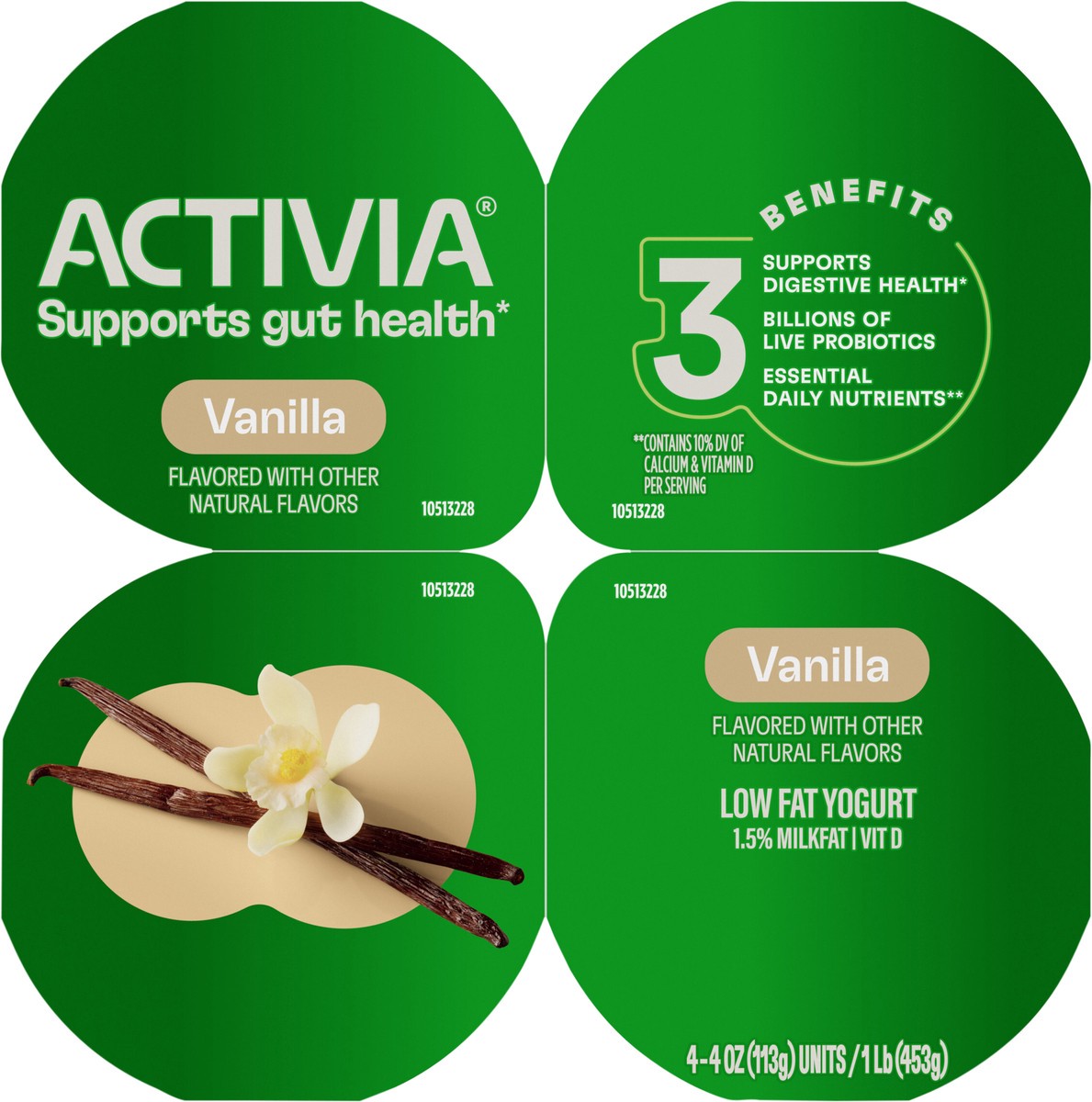 - DELICIOUSLY GOOD, BACKED BY SCIENCE: Four 4 oz snack cups of Activia Vanilla Probiotic Low Fat Yogurt with Vanilla Flavor