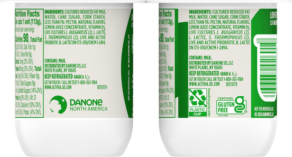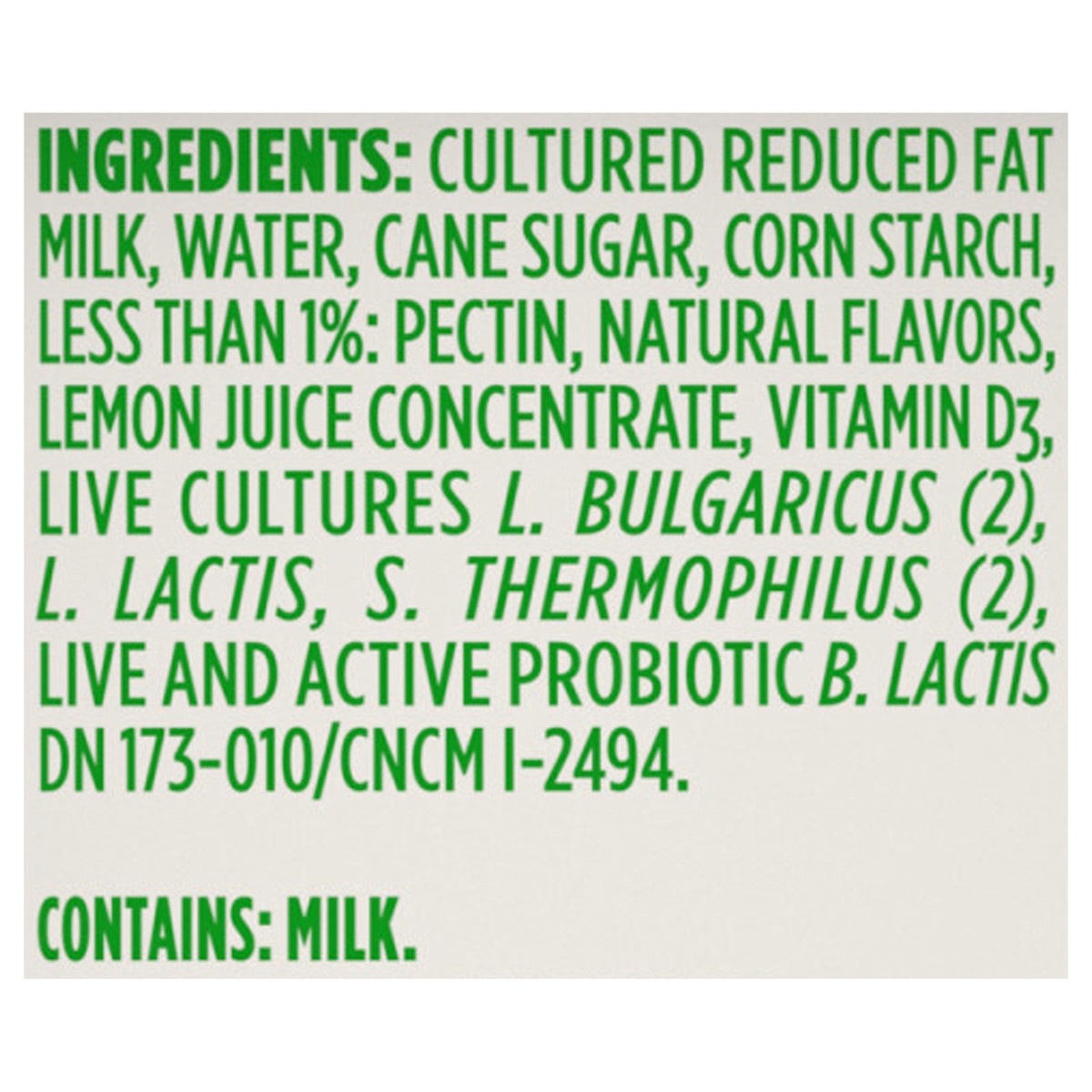 Cultured Reduced Fat Milk, Water, Cane Sugar, Corn Starch, Less than 1%: Pectin, Natural Flavors, Lemon Juice Concentrate, Vitamin D3, Live Cultures L. Bulgaricus (2), L,Lactis, S. Thermophilus (2), L…