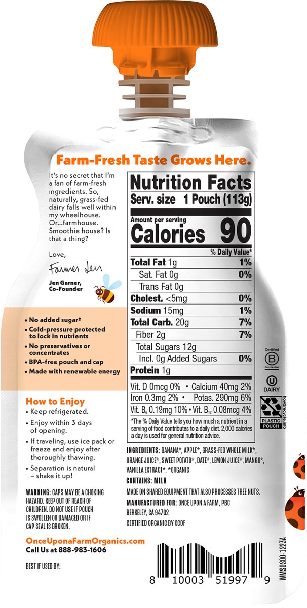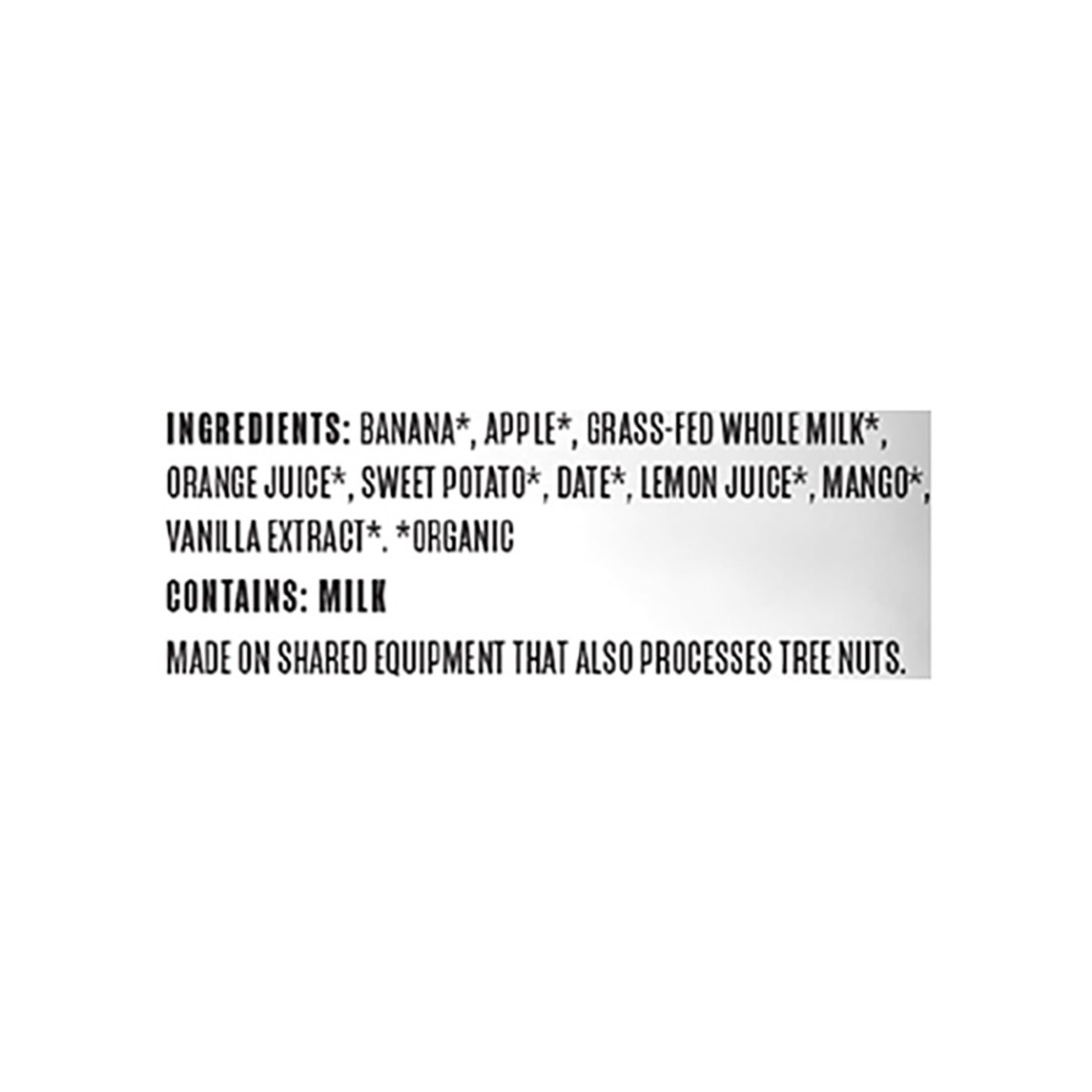 Banana*, Apple*, Grass-Fed Whole Milk*, Orange Juice*, Sweet Potato*, Date*, Lemon Juice*, Mango*, Vanilla Extract*. *Organic.