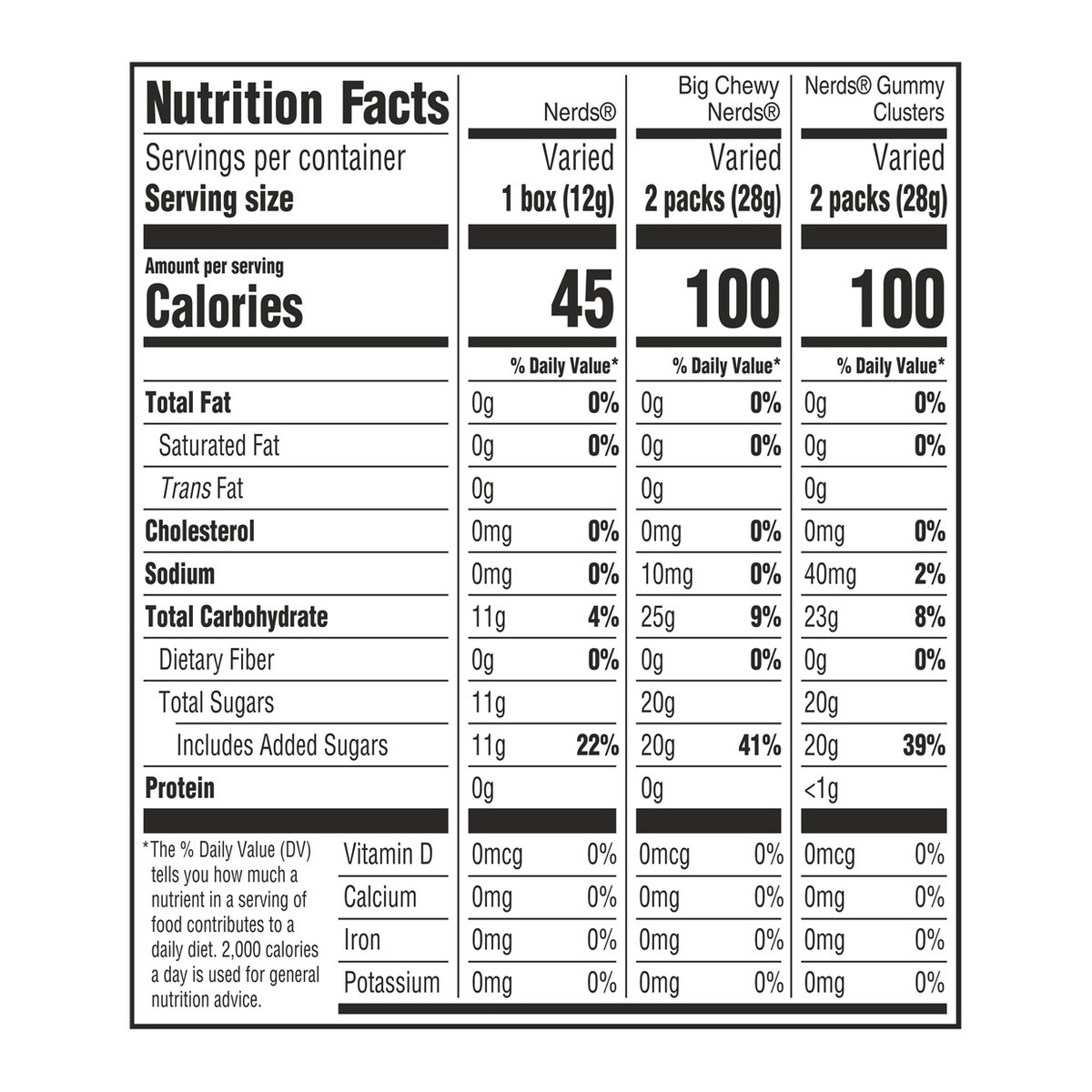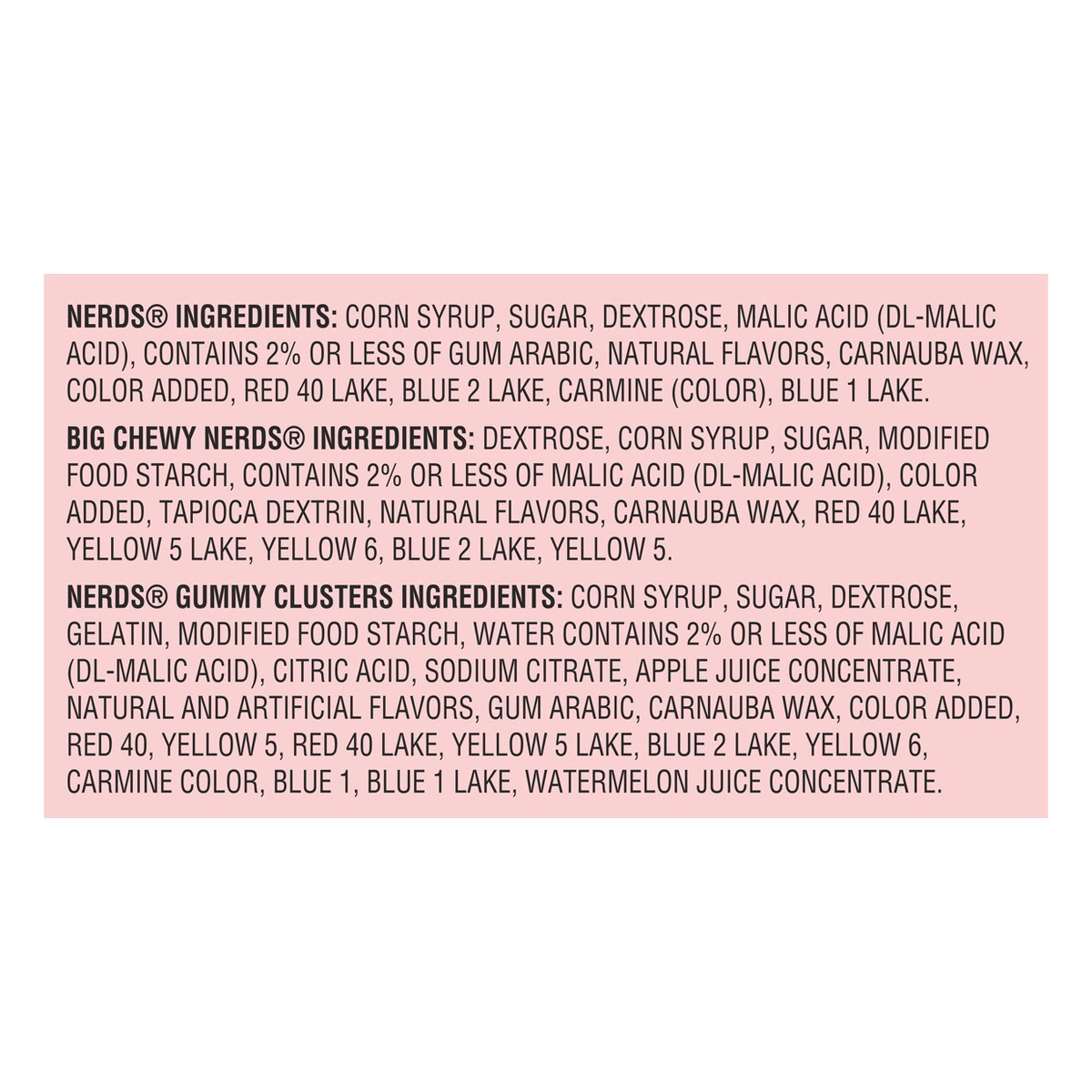 Nerds: Corn Syrup, Sugar, Dextrose, Malic Acid (DL-Malic Acid), Contains 2% or Less of Gum Arabic, Natural Flavors, Carnauba Wax, Color Added, Red 40 Lake, Blue 2 Lake, Carmine (Color), Blue 1 Lake. B…