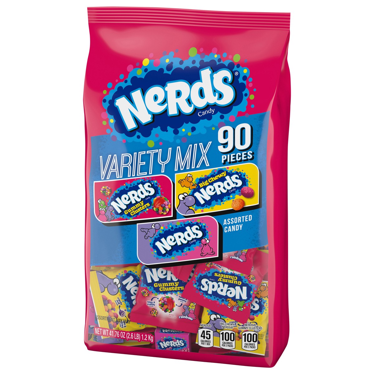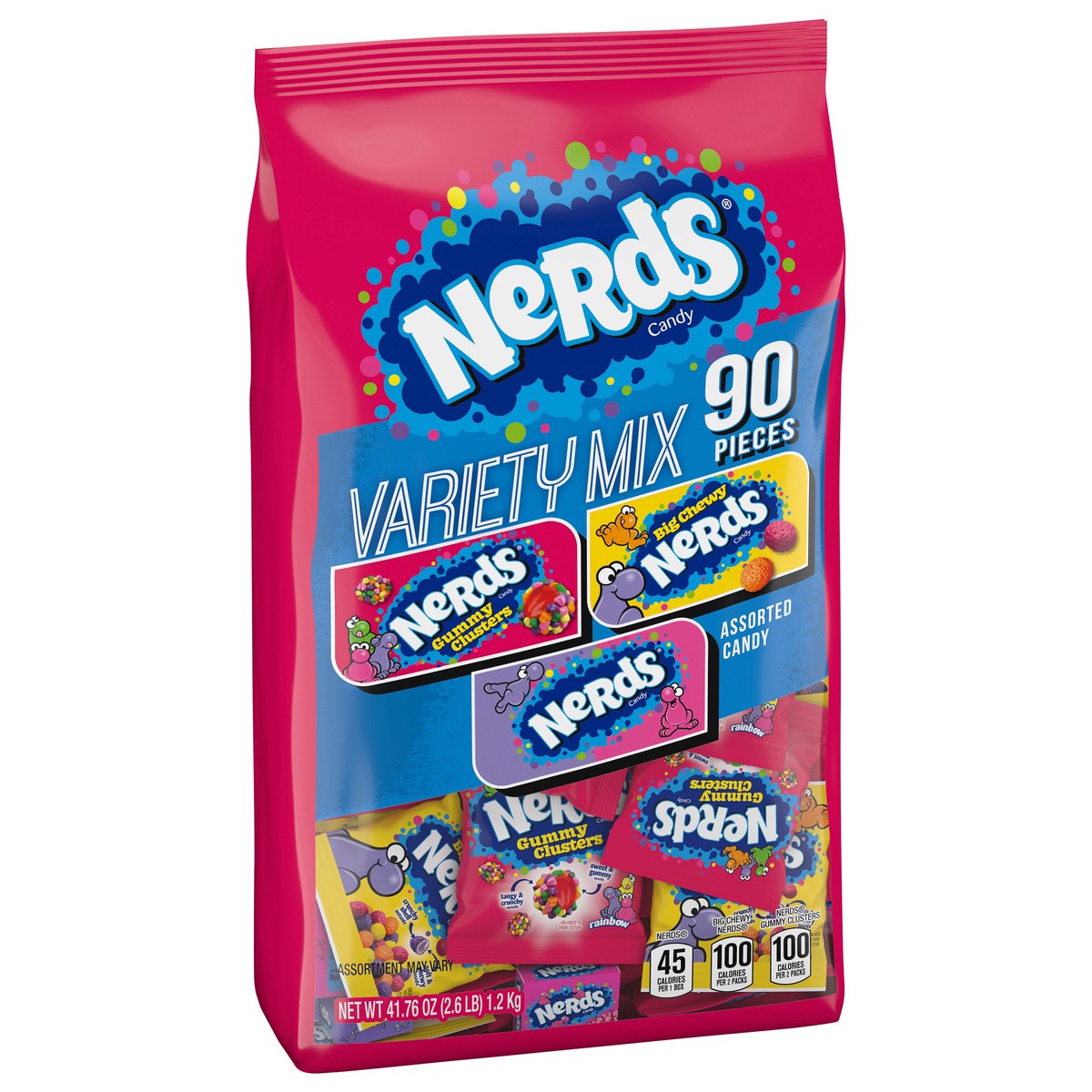This 90 count mixed bag of individually wrapped NERDS favorites is the perfect bulk candy bag! The pack includes treat size pouches of Big Chewy NERDS Candy, Grape and Strawberry Classic NERDS, and NE…