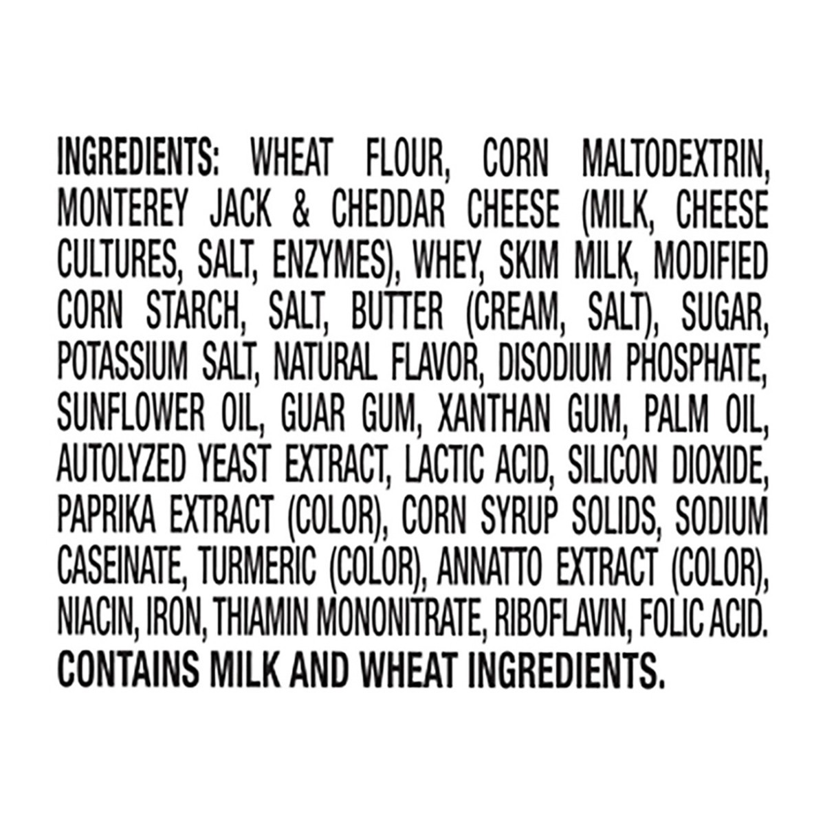 Wheat Flour, Corn Maltodextrin, Monterey Jack & Cheddar Cheese (Milk, Cheese Cultures, Salt, Enzymes), Whey, Skim Milk, Modified Corn Starch, Salt, Butter (Cream, Salt), Sugar, Potassium Salt, Natural…