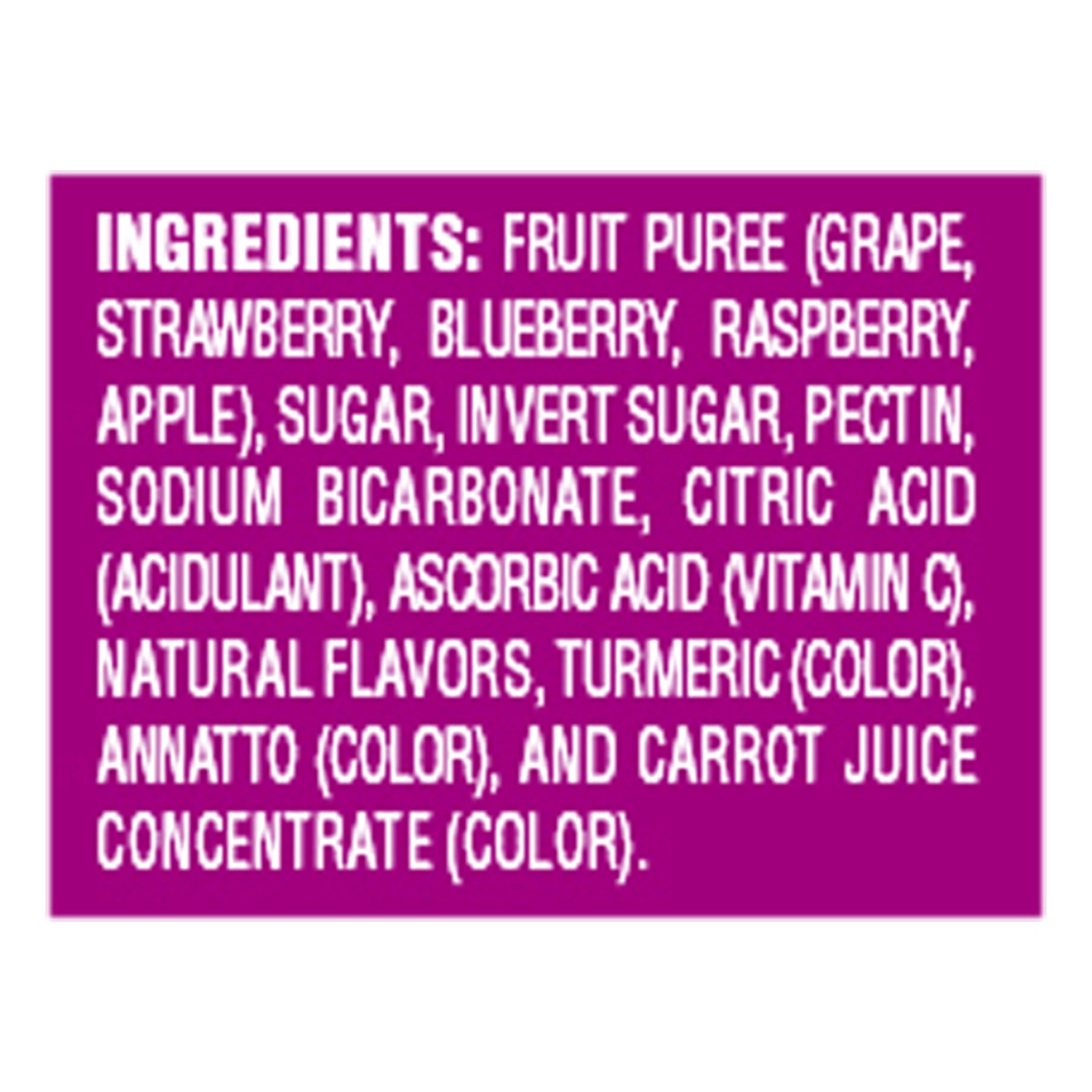 Fruit Puree (Grape, Strawberry, Blueberry, Raspberry, Apple), Sugar, Invert Sugar, Pectin, Sodium Bicarbonate, Citric Acid (Acidulant), Ascorbic Acid (Vitamin C), Natural Flavors, Turmeric (Color), An…