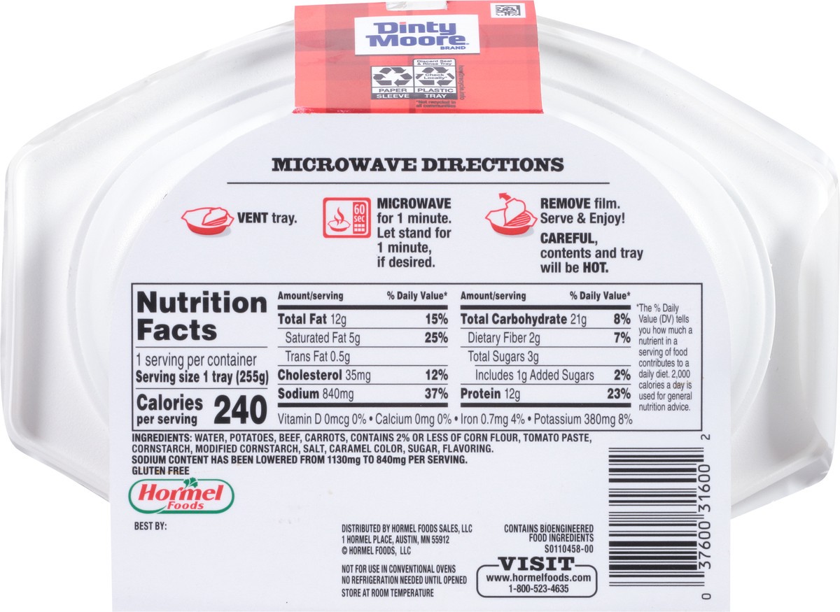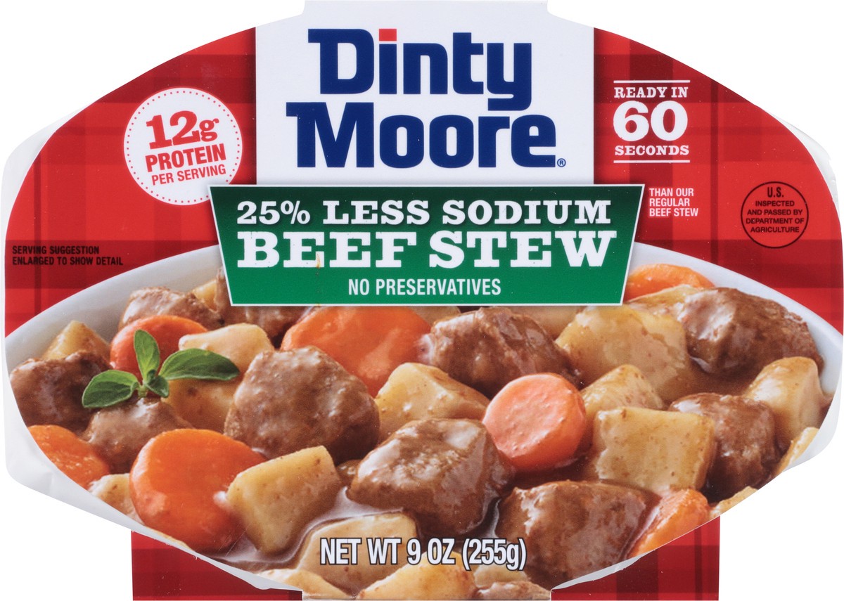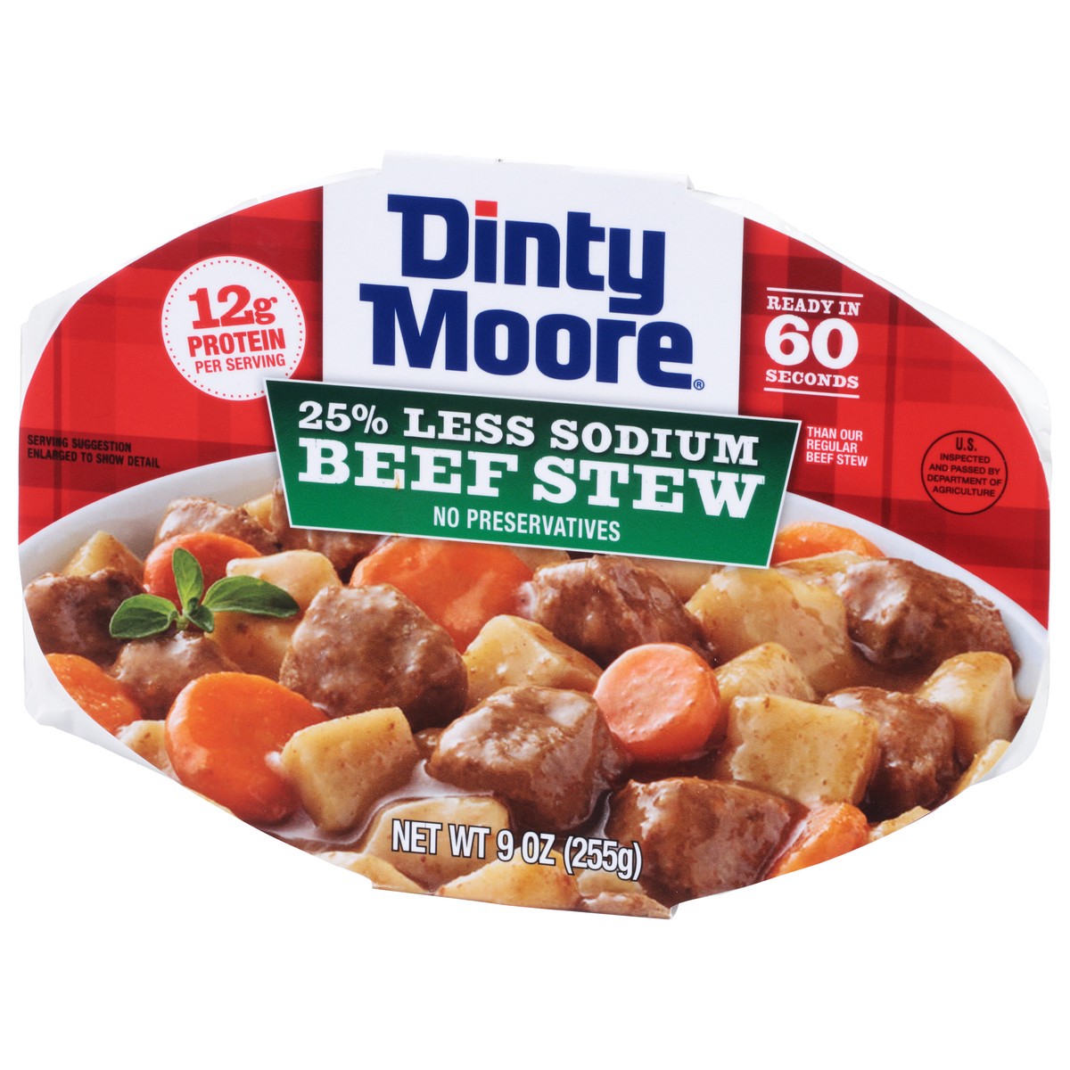 - Includes one 9 oz microwaveable tray of DINTY MOORE Beef Stew 25%Less Sodium* made with real chunks of beef