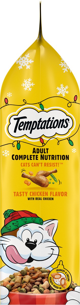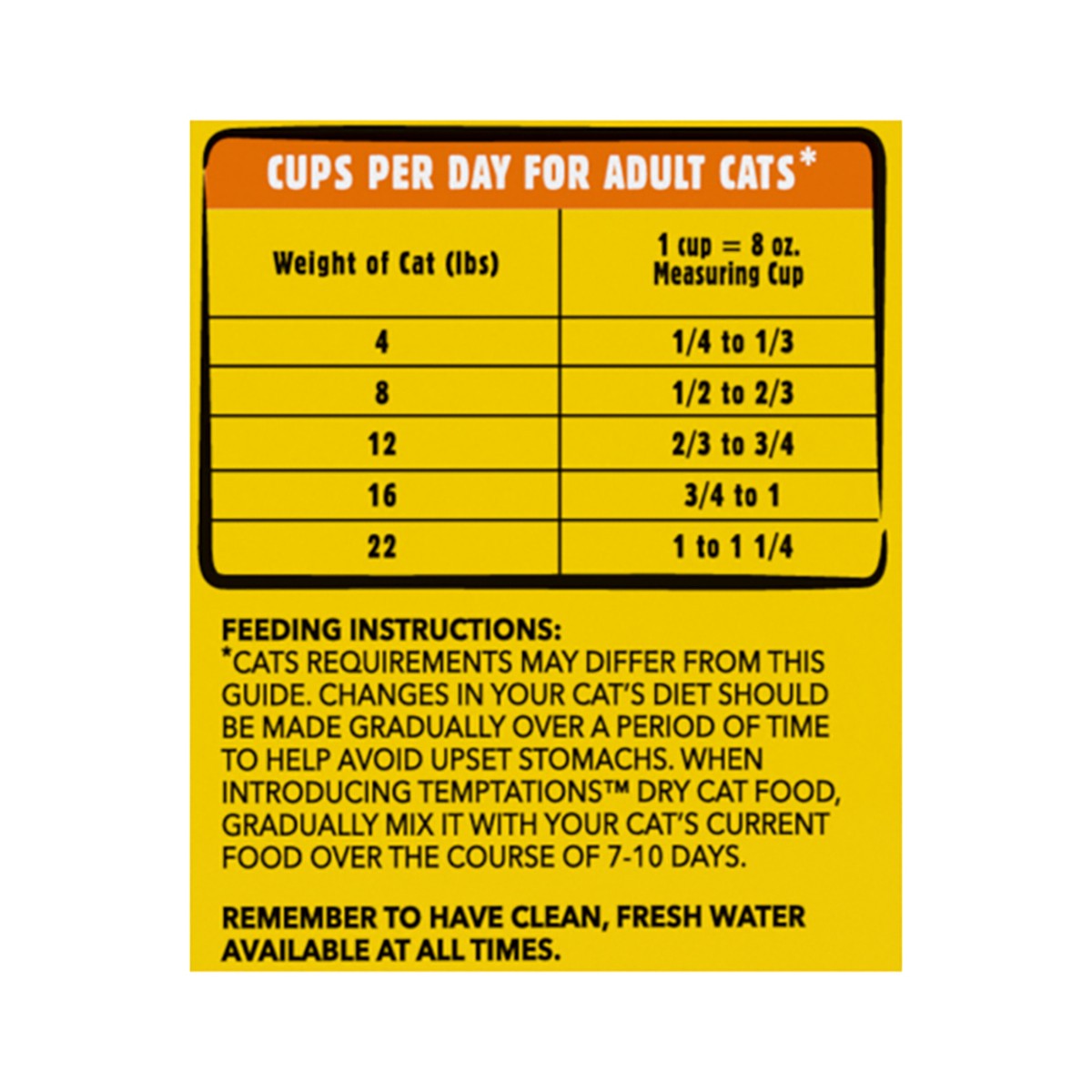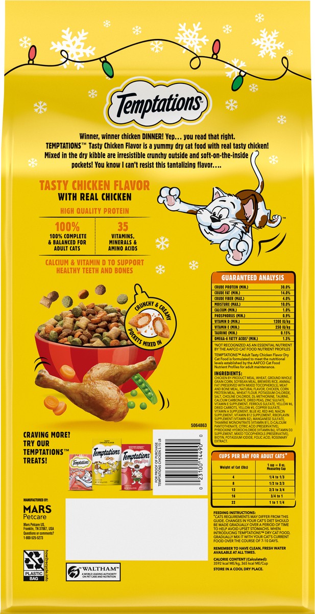 Calorie Content (Calculated): 3604 kcal ME/kg, 375 kcal ME/cup. Temptations Adult Tasty Chicken Flavor Dry Cat Food is formulated to meet the nutritional levels established by the AAFCO Cat Food Nutri…
