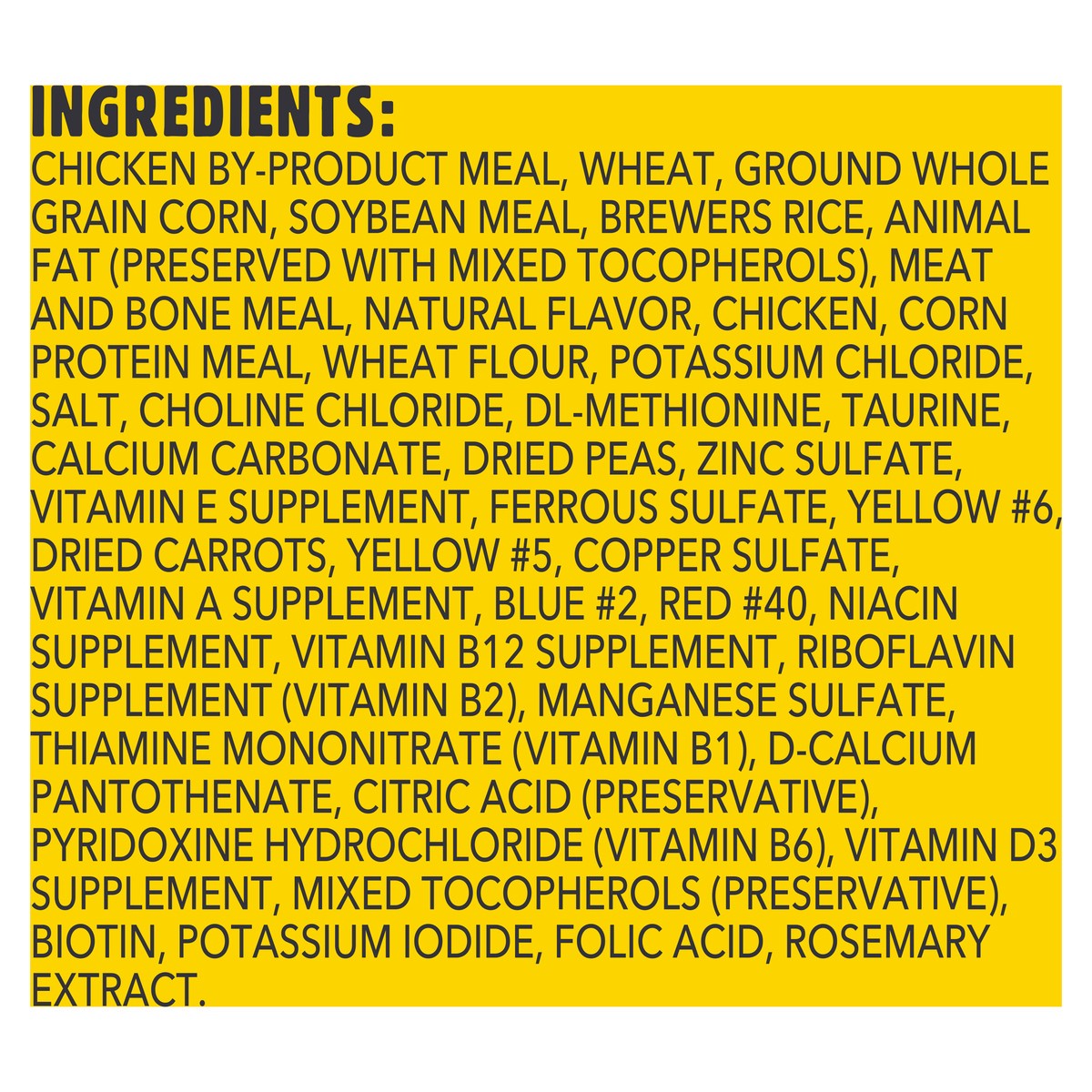 Chicken By-Product Meal, Ground Wheat, Ground Whole Grain Corn, Soybean Meal, Brewers Rice, Animal Fat (Preserved with Mixed Tocopherols), Meat and Bone Meal, Natural Flavor, Chicken, Corn Protein Mea…