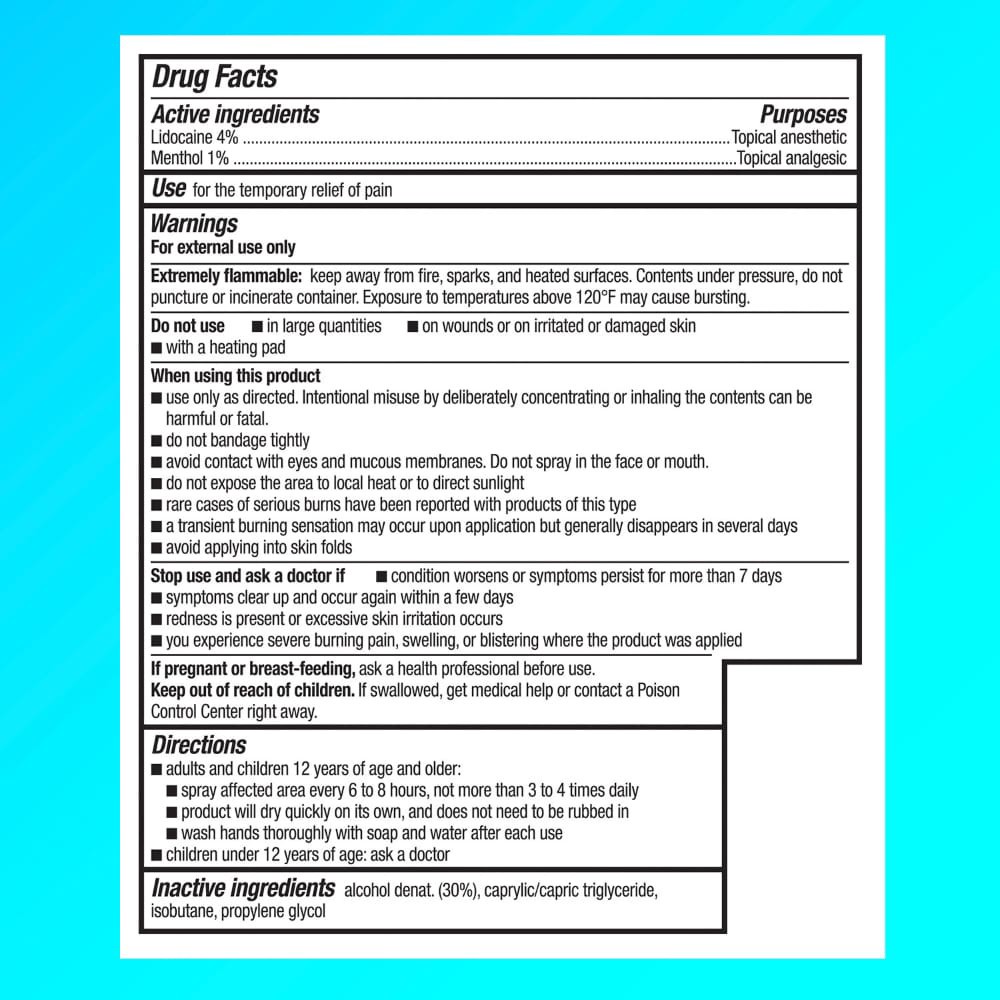 Active Ingredients: Lidocaine (4 %), Topical Anesthetic; Menthol (1 %), Topical Analgsic. Inactive Ingredients: Alcohol Denat. (30%), Caprylic/Capric Triglycerides, Isobutane, Propylene Glycol.