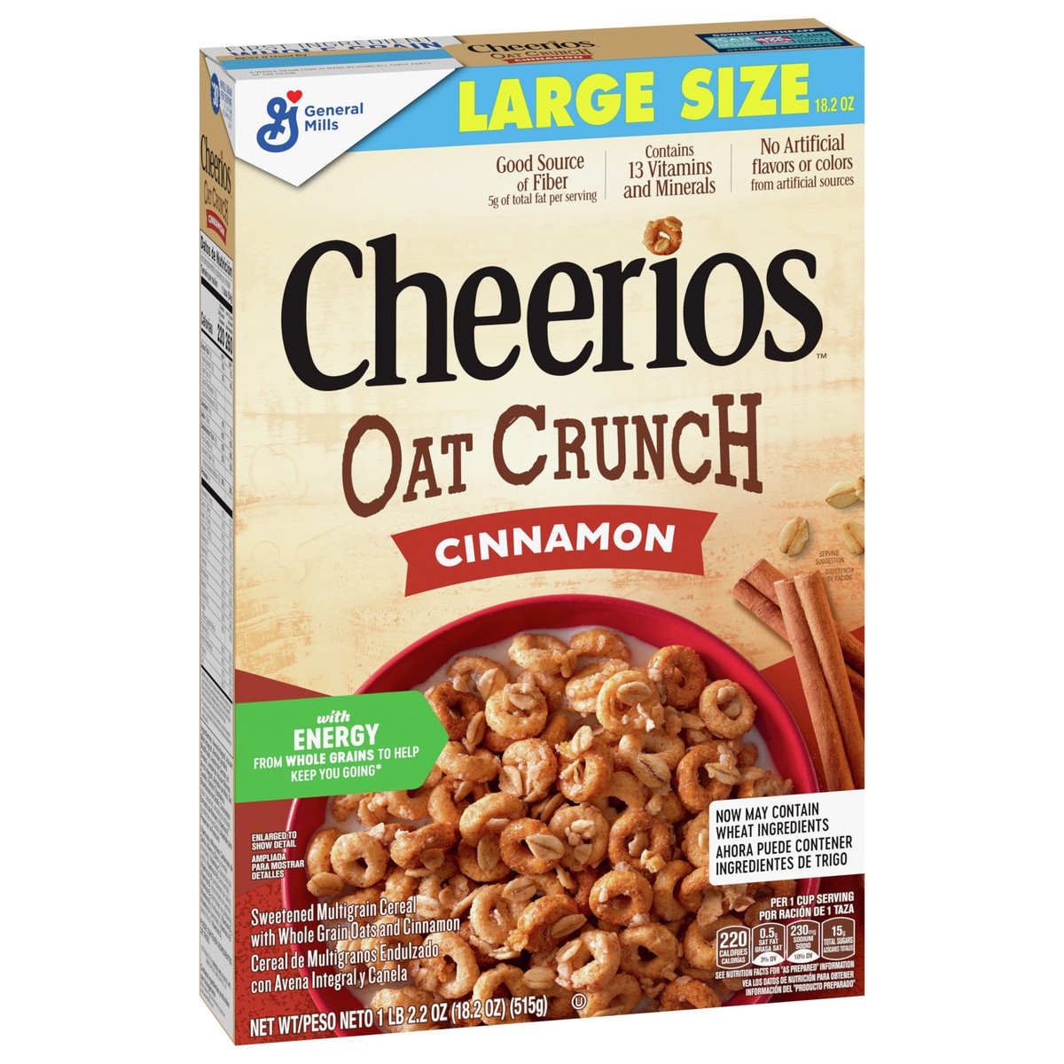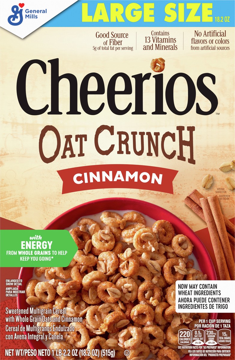 Oats on Os! Start your day with the irresistible crunch of Cheerios Oat Crunch Cinnamon breakfast cereal. This sweetened multigrain cereal is made with whole grain oats and topped with real cinnamon f…