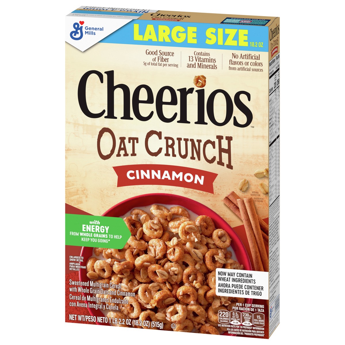 Oats on Os! Start your day with the irresistible crunch of Cheerios Oat Crunch Cinnamon breakfast cereal. This sweetened multigrain cereal is made with whole grain oats and topped with real cinnamon f…