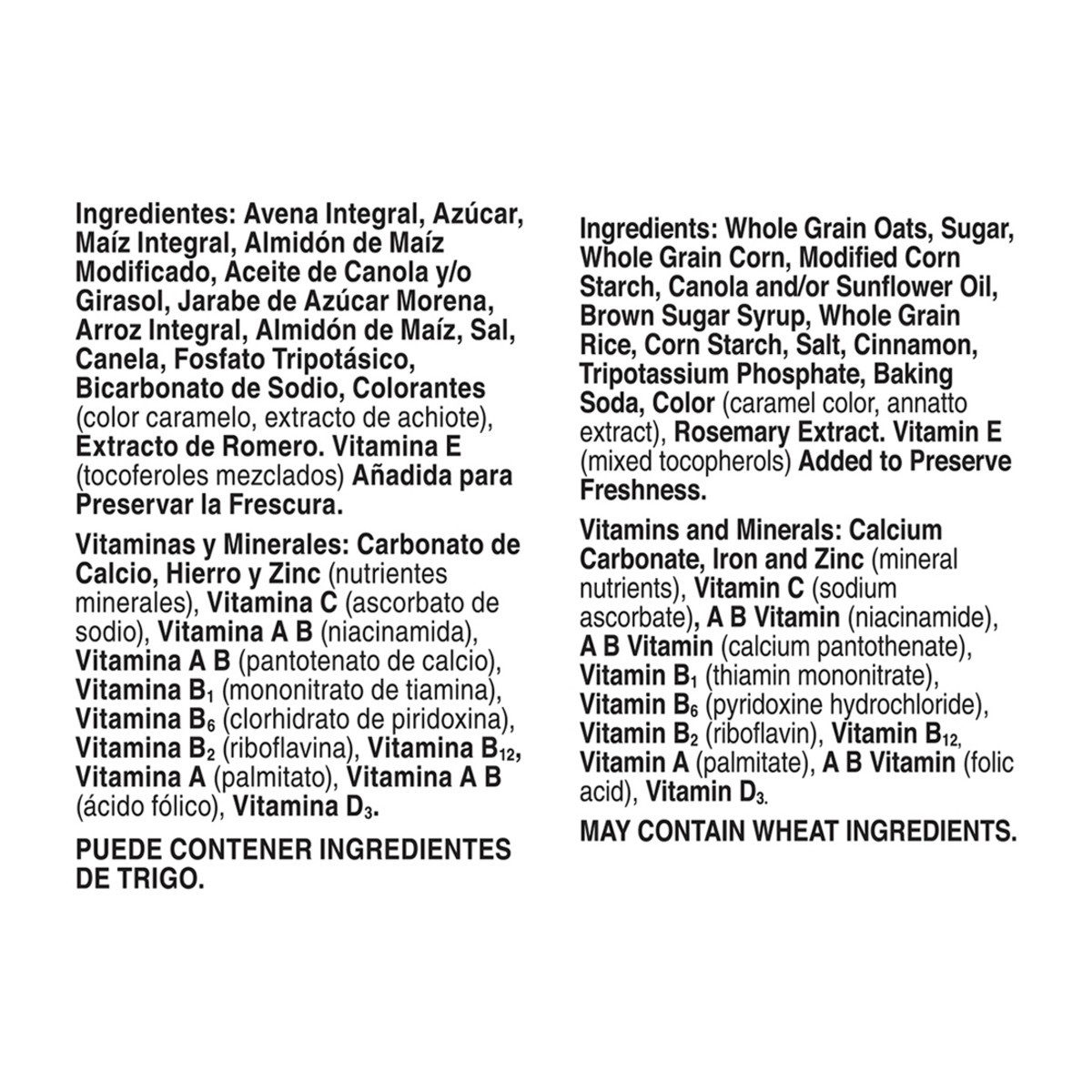 Whole Grain Oats, Sugar, Whole Grain Corn, Modified Corn Starch, Canola and/or Sunflower Oil, Brown Sugar Syrup, Whole Grain Rice, Corn Starch, Salt, Cinnamon, Tripotassium Phosphate, Baking Soda, Col…