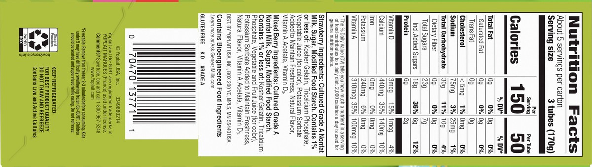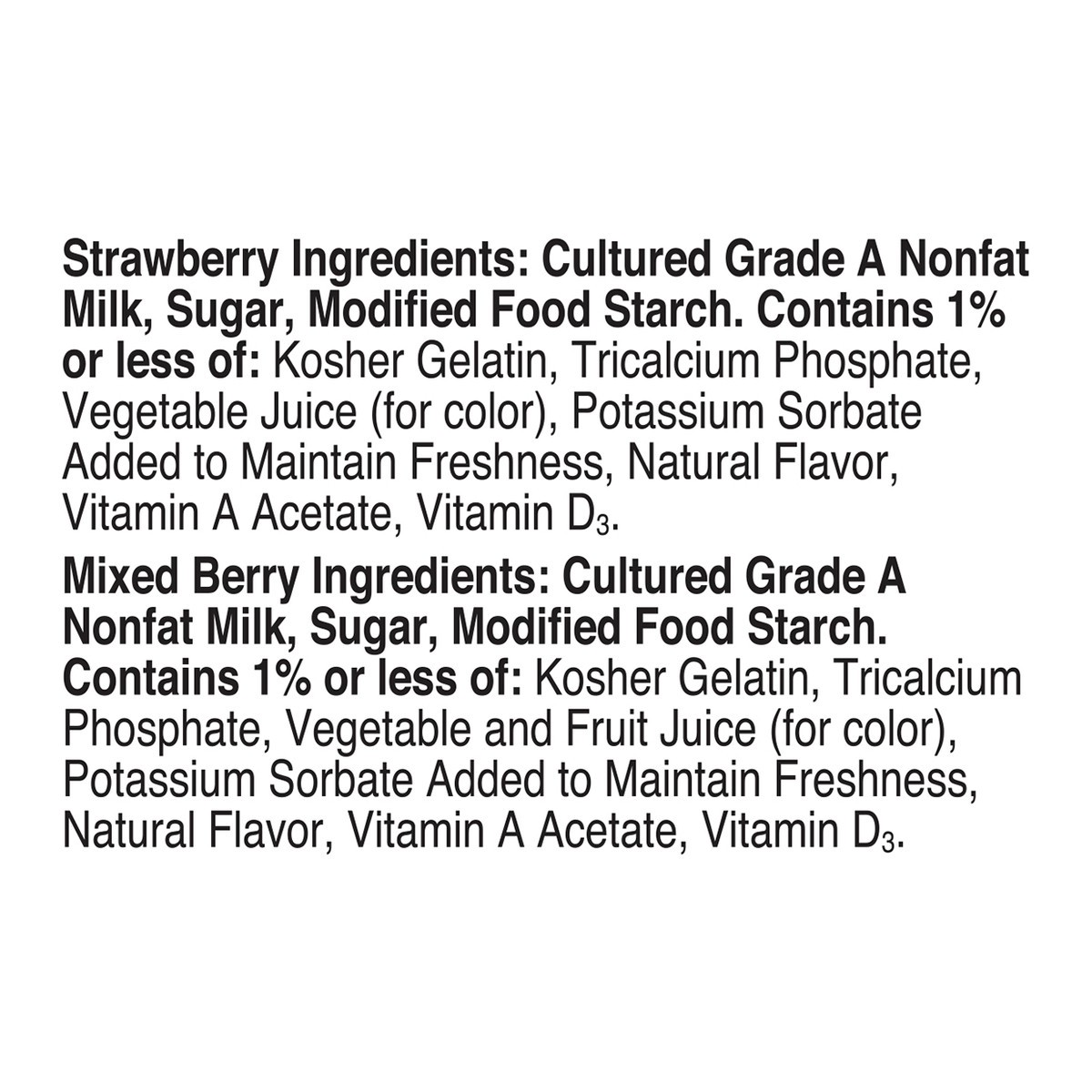 Strawberry: Cultured Grade A Nonfat Milk, Sugar, Modified Food Starch. Contains 1% or Less of: Kosher Gelatin, Tricalcium Phosphate, Corn Starch, Vegetable Juice (for Color), Potassium Sorbate Added t…