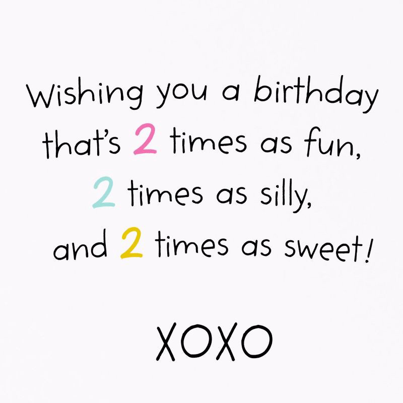 - Inside Message: Wishing you a birthday that's 2 times as fun, 2 times as silly, and 2 times as sweet! XOXO