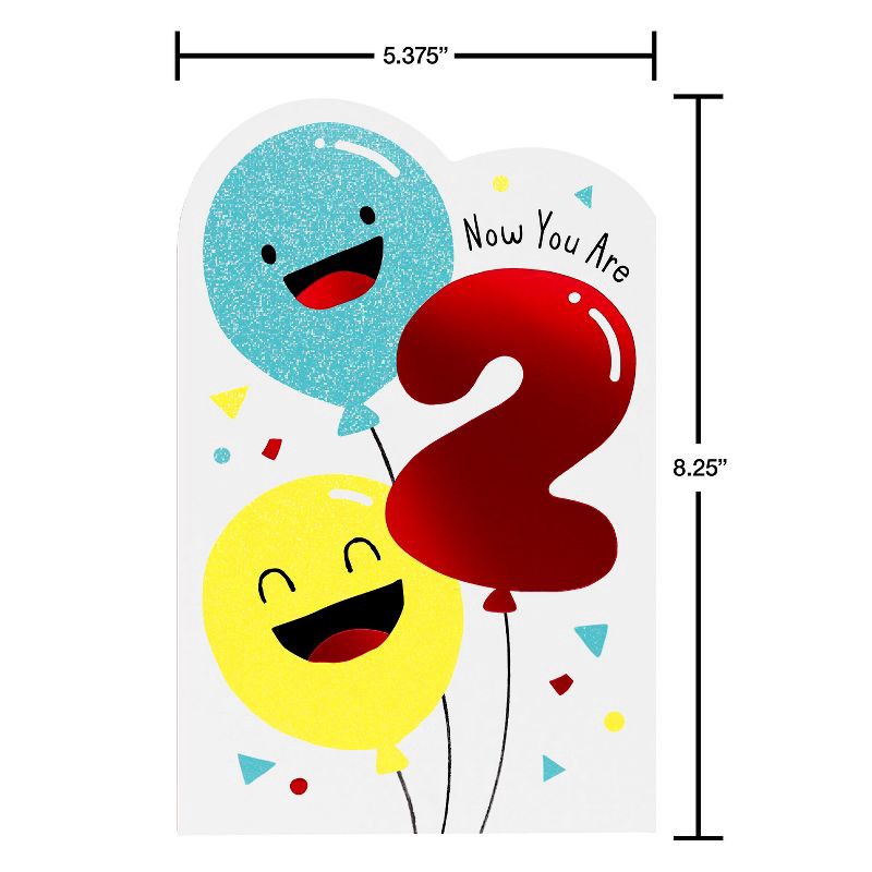 - DESIGN & FINISHINGS: This lively juvenile birthday card features animated balloons with expressive faces and a giant red numeral '2', blended with vibrant color splashes and glitter details, evoking excitement and joy perfect for a child's second birthday.