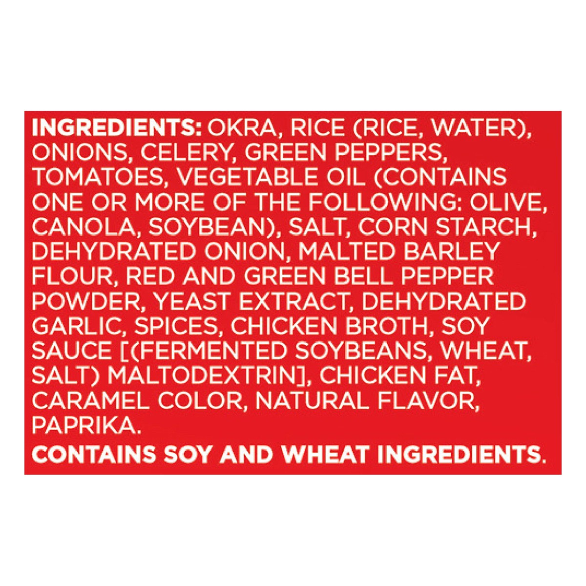 Okra, Rice (Rice, Water), Onions, Celery, Green Peppers, Tomatoes, Salt, Corn Starch, Dehydrated Onion, Malted Barley Flour, Red and Green Bell Pepper Powder, Yeast Extract, Dehydrated Garlic, Spices,…