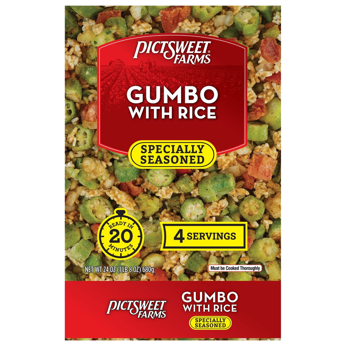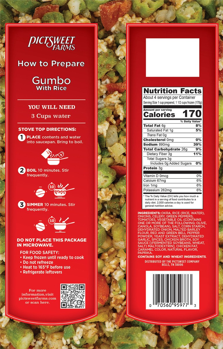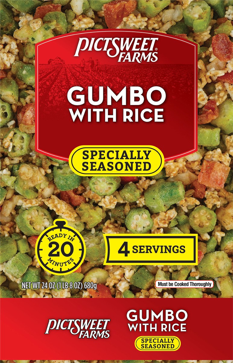Pictsweet Gumbo with Rice Specially Seasoned. Serves 4. Ready in 20 minutes.