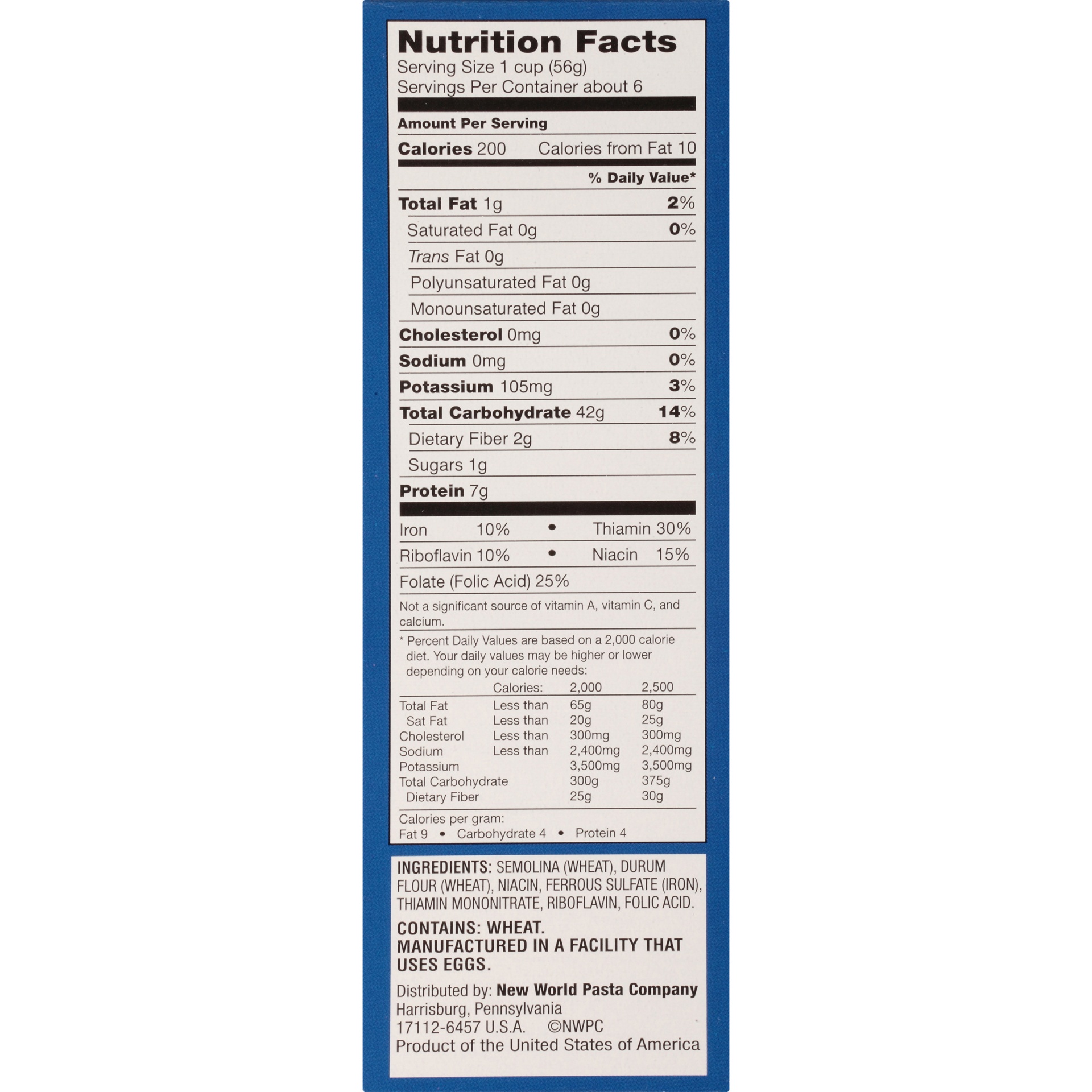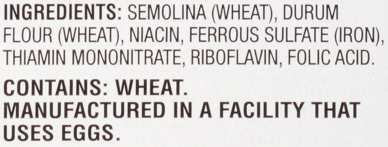 Durum Wheat Semolina\, Durum Wheat Flour\, Niacin\, Ferrous Sulfate (Iron)\, Thiamin Mononitrate\, Riboflavin\, Folic Acid.