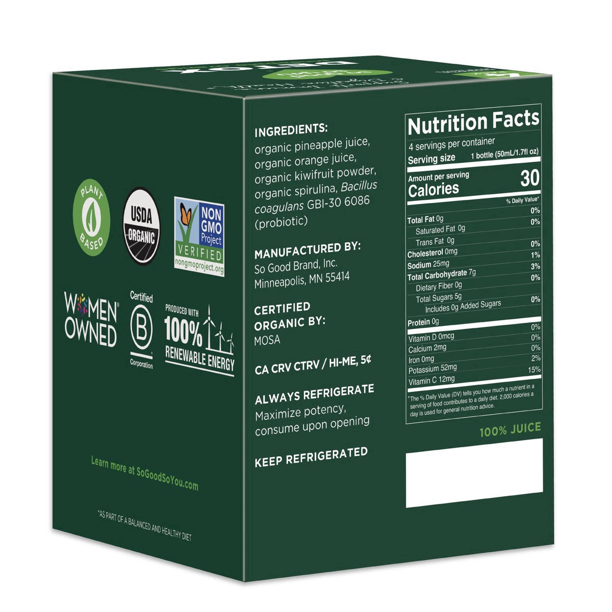 Organic Pineapple Juice, Organic Orange Juice, Organic Kiwifruit Powder, Organic Spirulina, Bacillus Coagulans GBI-30 6086 (Probiotic).