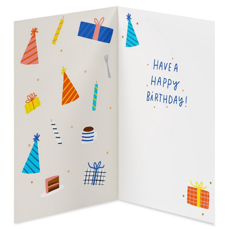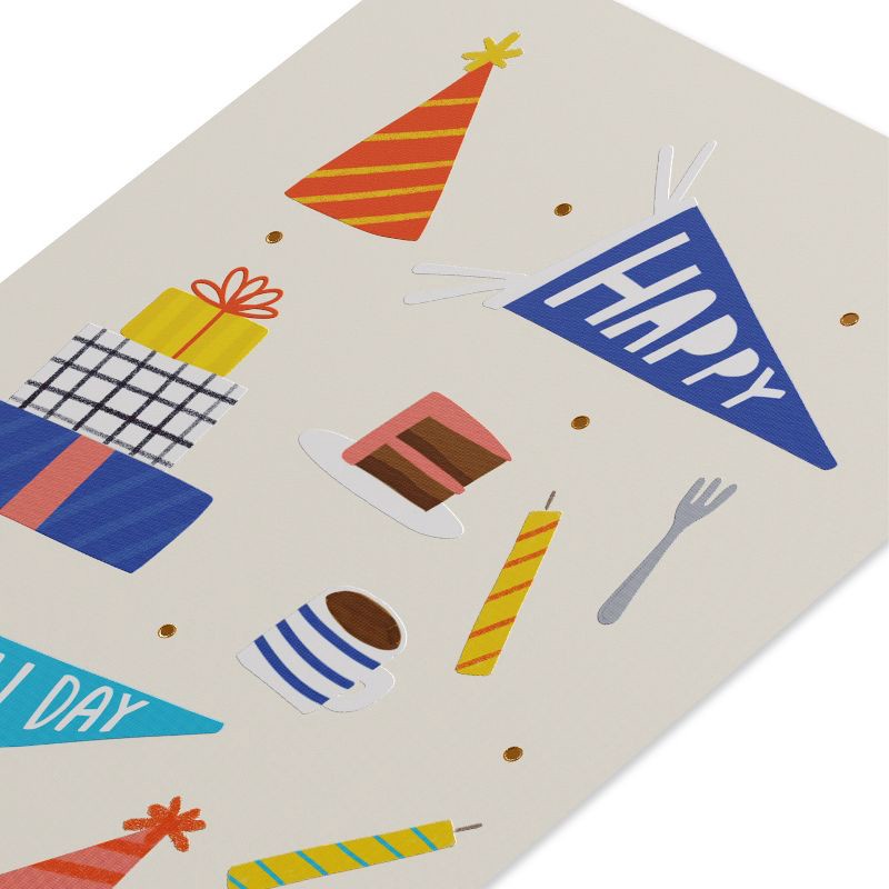- DESIGN & FINISHINGS: This vibrant birthday card features joyful pennants, gift boxes, and celebration icons in a playful and colorful arrangement on high-quality paper stock.