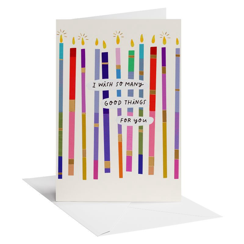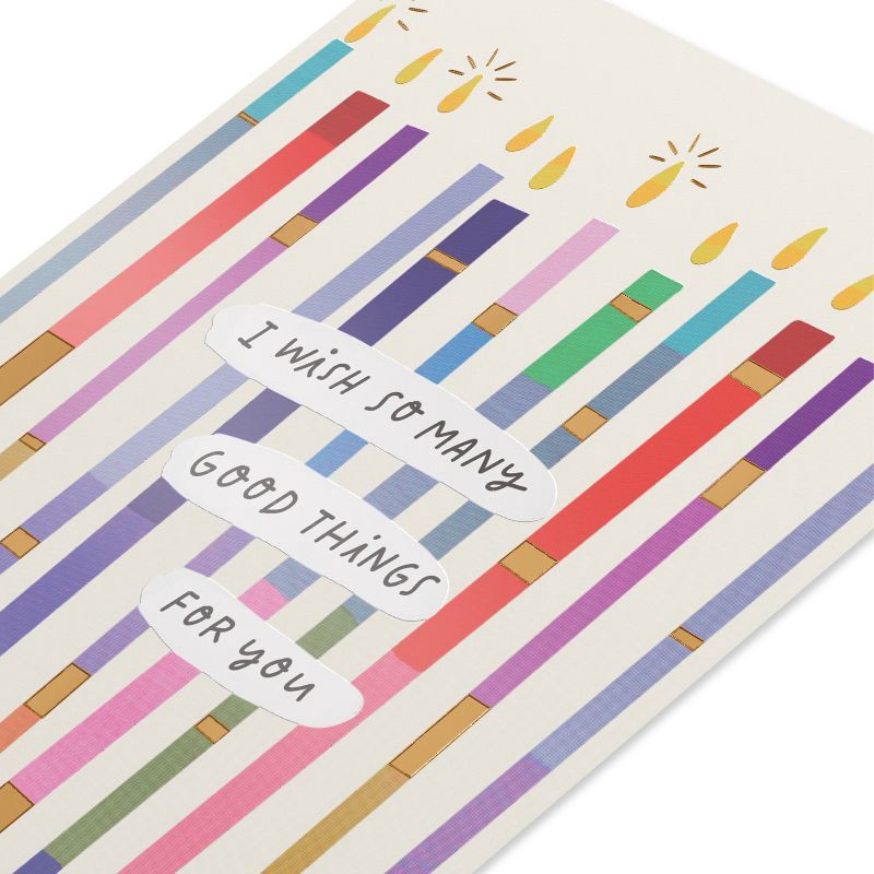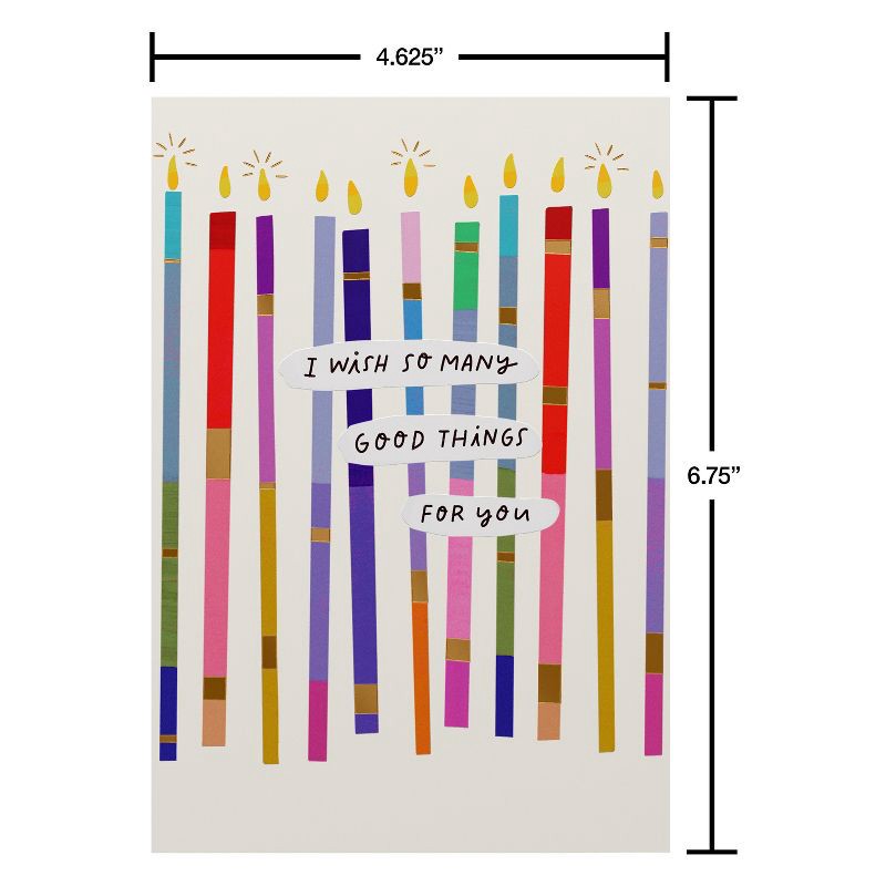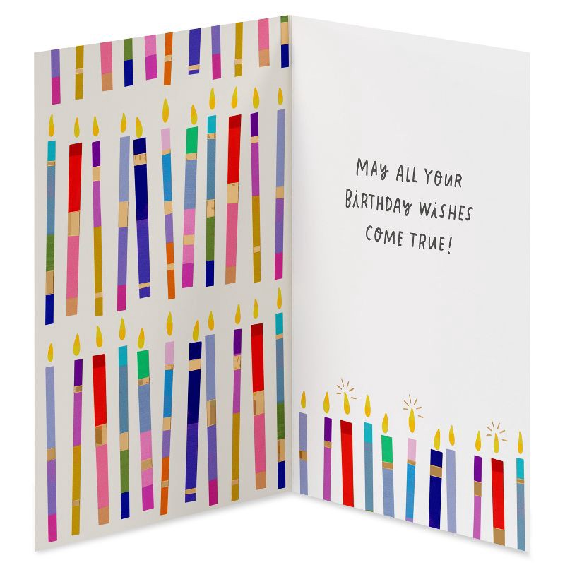 - DESIGN & FINISHINGS: This birthday card showcases colorful tall candles with unique foil accents that add a spark of joy and festivity to your birthday greetings